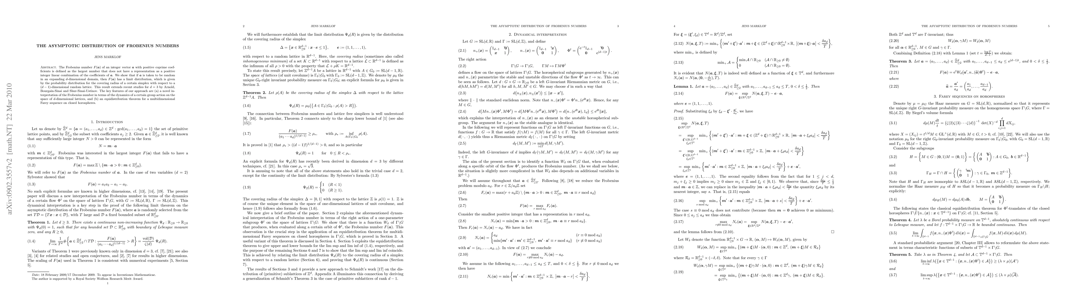 The Frobenius number F(a) of an integer vector a with positive coprime coefficients is defined as the largest number that does not have a representation as a positive integer linear combination of the coefficients of a. We show that if a is taken to be random in an expanding d-dimensional domain, then F(a) has a limit distribution, which is given by the probability distribution for the covering radius of a certain simplex with respect to a (d-1)-dimensional random lattice. This result extends recent studies for d=3 by Arnold, Bourgain-Sinai and Shur-Sinai-Ustinov. The key features of our approach are (a) a novel interpretation of the Frobenius number in terms of the dynamics of a certain group action on the space of d-dimensional lattices, and (b) an equidistribution theorem for a multidimensional Farey sequence on closed horospheres.