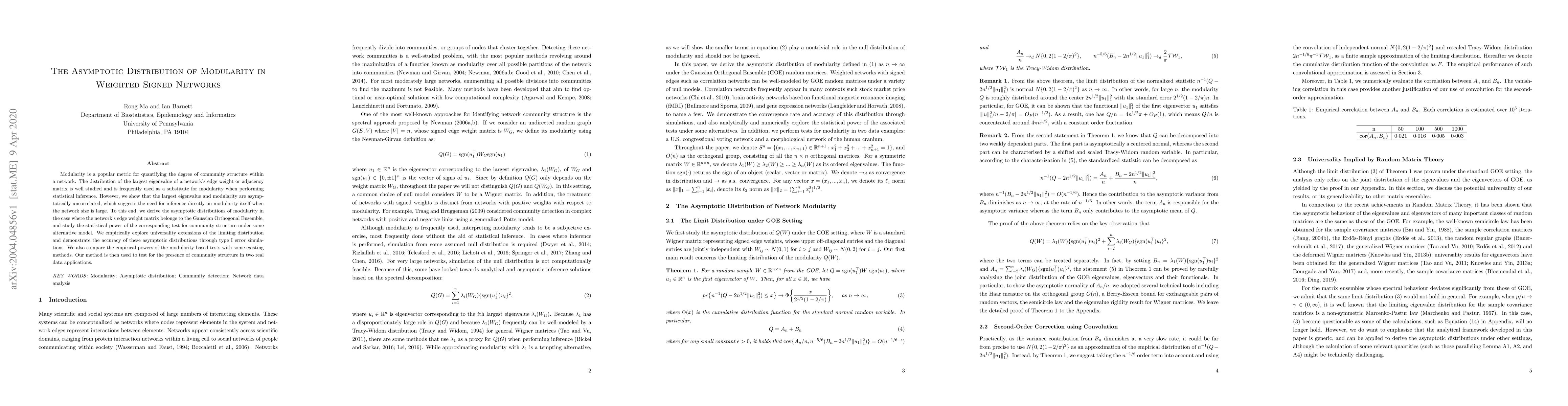 This study finds that modularity in weighted signed networks is asymptotically uncorrelated with the largest eigenvalue of its edge weight matrix, suggesting a need for inference on modularity itself when networks are large. The researchers derive an asymptotic distribution for modularity and demonstrate its accuracy through simulations.
