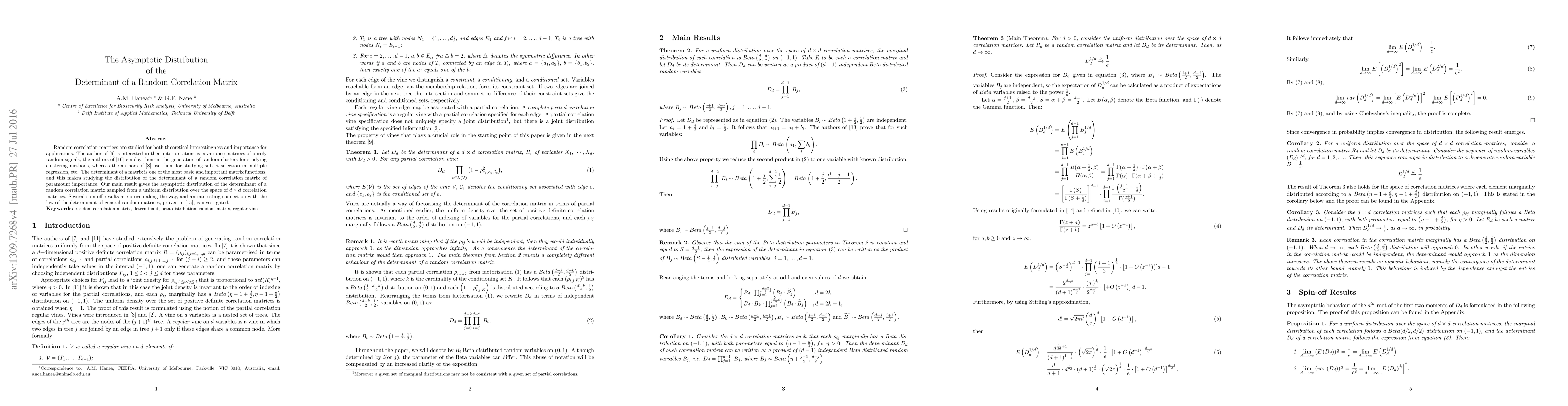 The paper presents a detailed asymptotic analysis of the determinant of random correlation matrices, deriving expressions for their moments and proving the asymptotic normality of the logarithm of the determinant.
