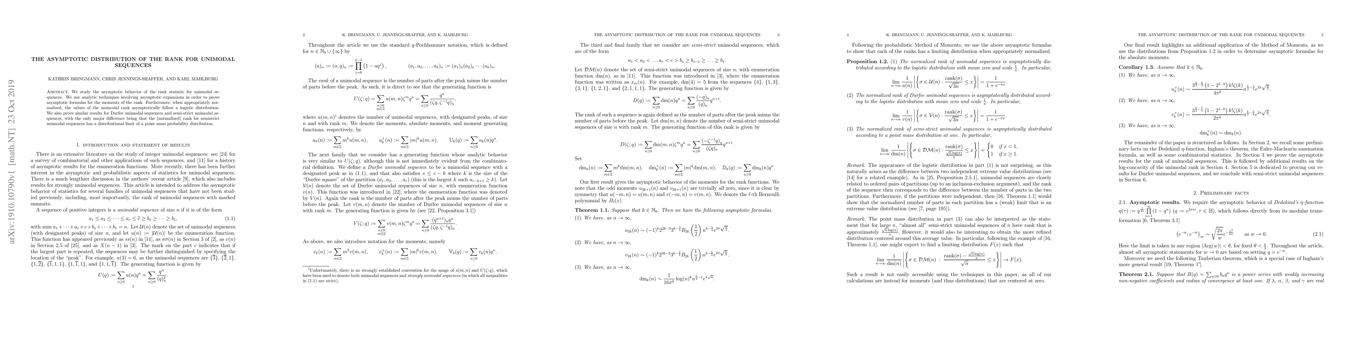 This paper investigates the asymptotic distribution of the rank statistic for unimodal sequences, revealing that normalized ranks follow a logistic distribution. It also extends findings to Durfee and semi-strict unimodal sequences, with the latter showing a point mass probability distribution limit.