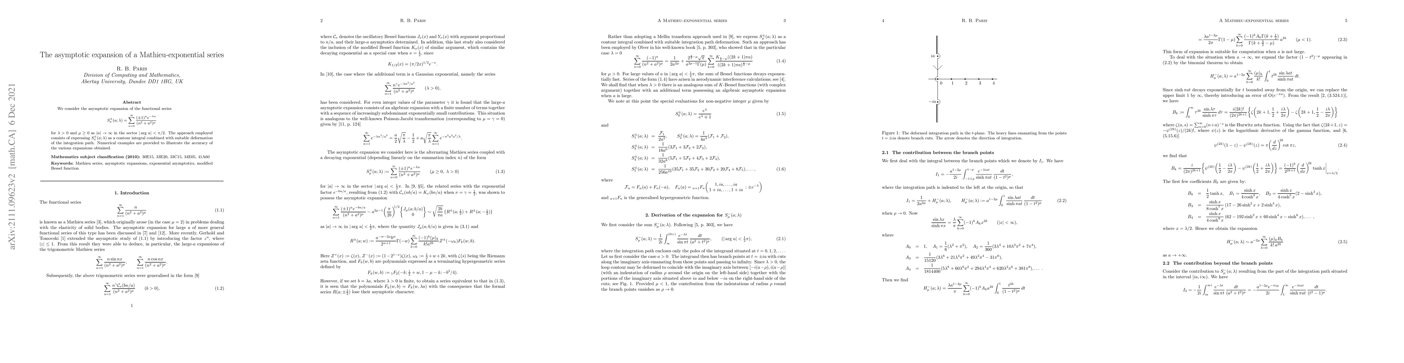 This paper investigates the asymptotic expansion of the Mathieu-exponential series \(S_{\mu}^\pm(a;\lambda)\) for large \(|a|\) in the sector \(|\arg\,a|<\pi/2\). The authors derive the expansion using a contour integral approach and validate the results with numerical examples.