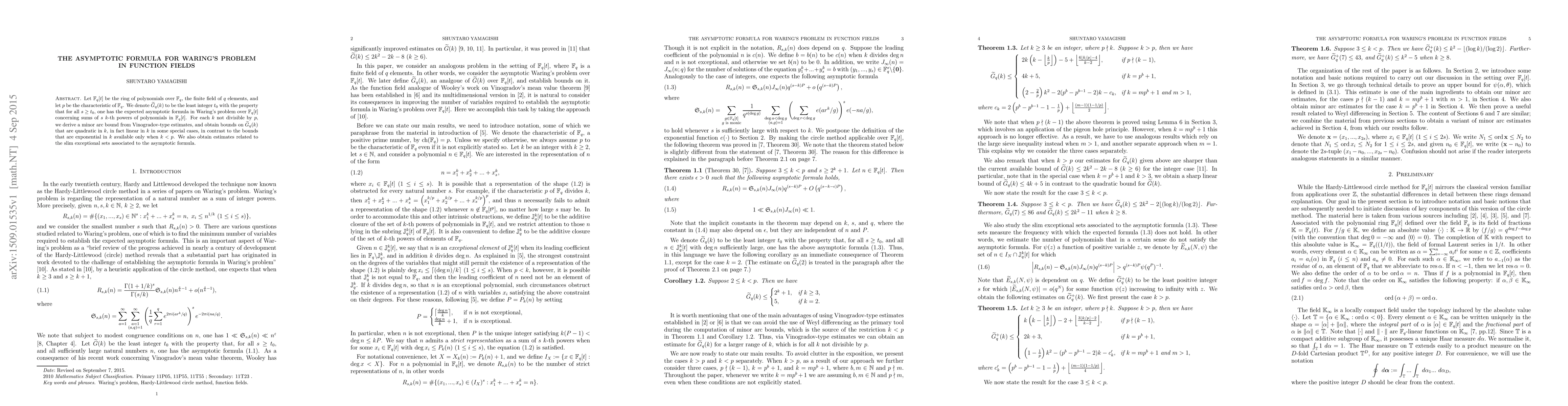The paper derives asymptotic formulas for Waring's problem in function fields over finite fields, providing bounds on the least integer $t_0$ for sums of $k$-th powers of polynomials. The derived bounds are quadratic in $k$ and linear in some cases, significantly improving upon the previously exponential bounds for $k < p$.