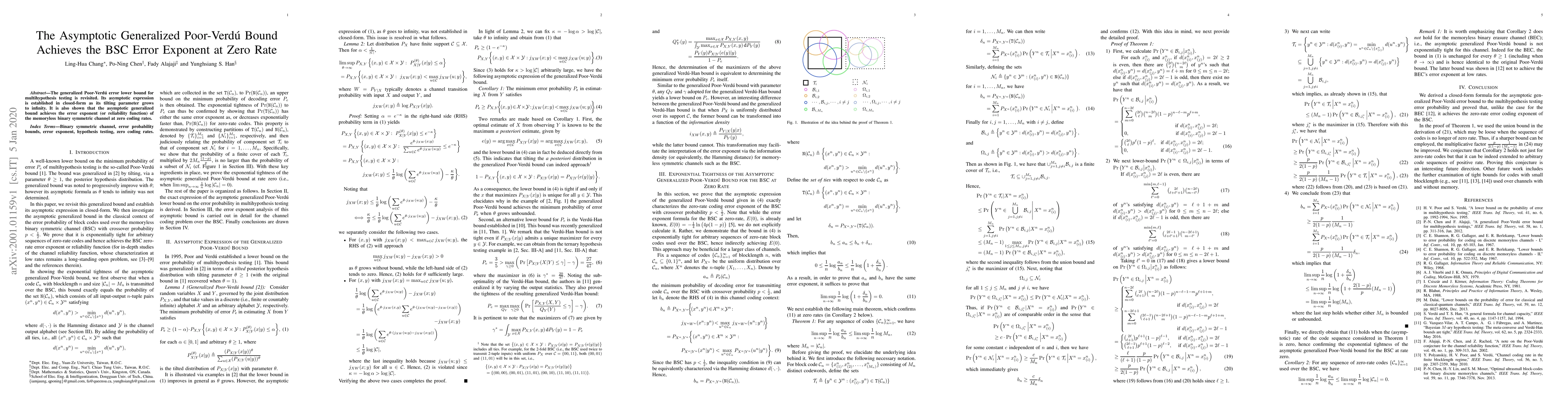 The derivation of a new lower bound on the probability of error for multihypothesis testing and its application to the binary symmetric channel.