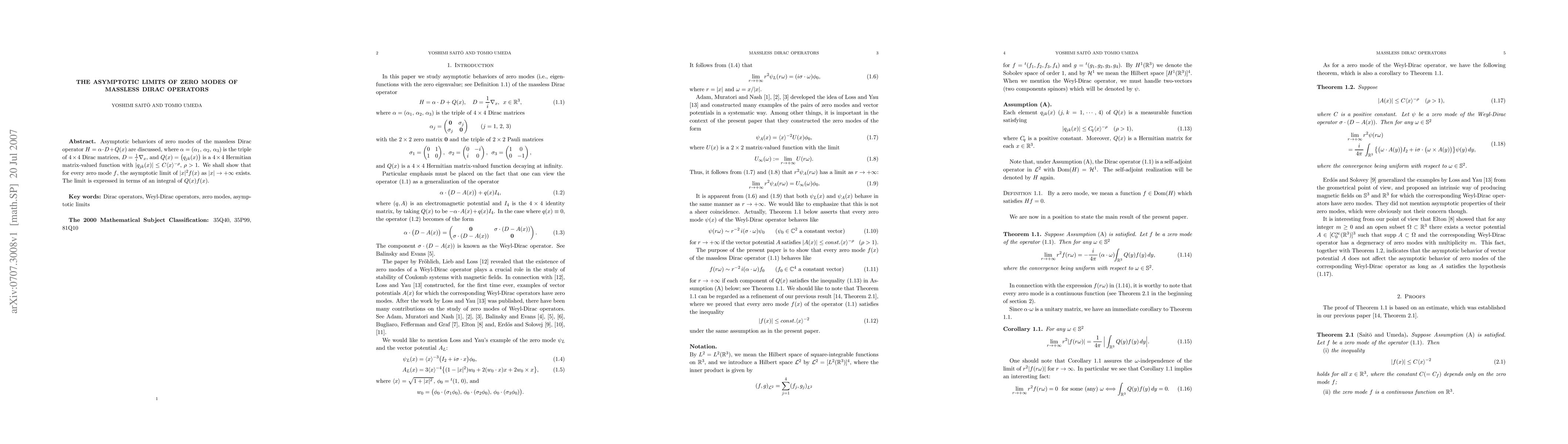 The paper investigates the asymptotic limits of zero modes of massless Dirac operators, showing that for every zero mode, a limit exists as |x| approaches infinity in terms of an integral involving the matrix-valued function Q(x).