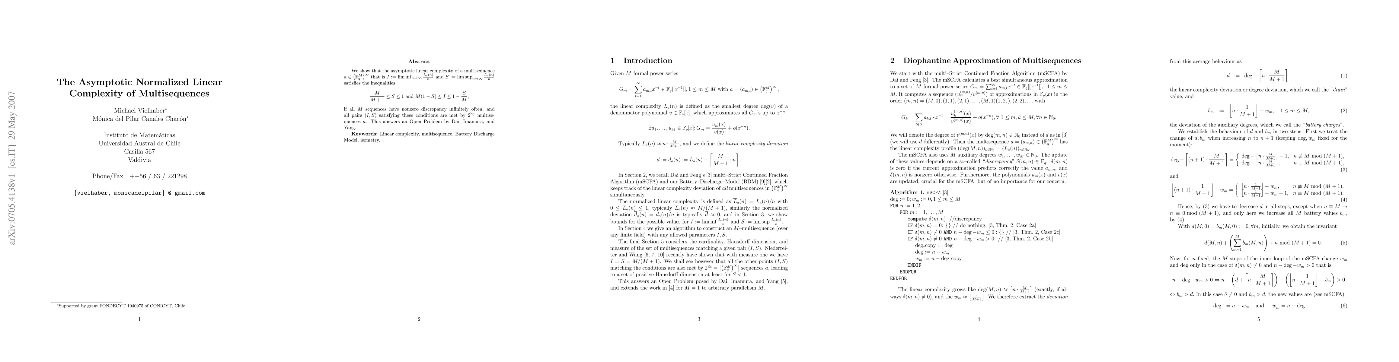 We show that the asymptotic linear complexity of a multisequence a in F_q^\infty that is I := liminf L_a(n)/n and S := limsup L_a(n)/n satisfy the inequalities M/(M+1) <= S <= 1 and M(1-S) <= I <= 1-S/M, if all M sequences have nonzero discrepancy infinitely often, and all pairs (I,S) satisfying these conditions are met by 2^{\aleph_0} multisequences a. This answers an Open Problem by Dai, Imamura, and Yang. Keywords: Linear complexity, multisequence, Battery Discharge Model, isometry.