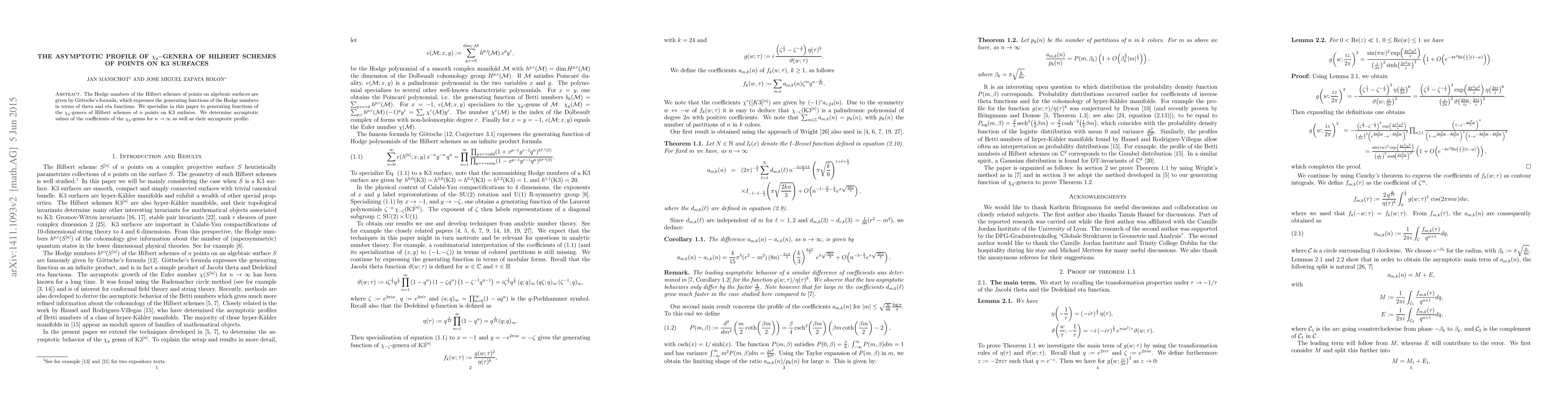The Hodge numbers of the Hilbert schemes of points on algebraic surfaces are given by G\"ottsche's formula, which expresses the generating functions of the Hodge numbers in terms of theta and eta functions. We specialize in this paper to generating functions of the $\chi_y(\mathrm{K3}^{[n]})$ genera of Hilbert schemes of $n$ points on K3 surfaces. We determine asymptotic values of the coefficients of the $\chi_y$-genus for $n\to \infty$ as well as their asymptotic profile.