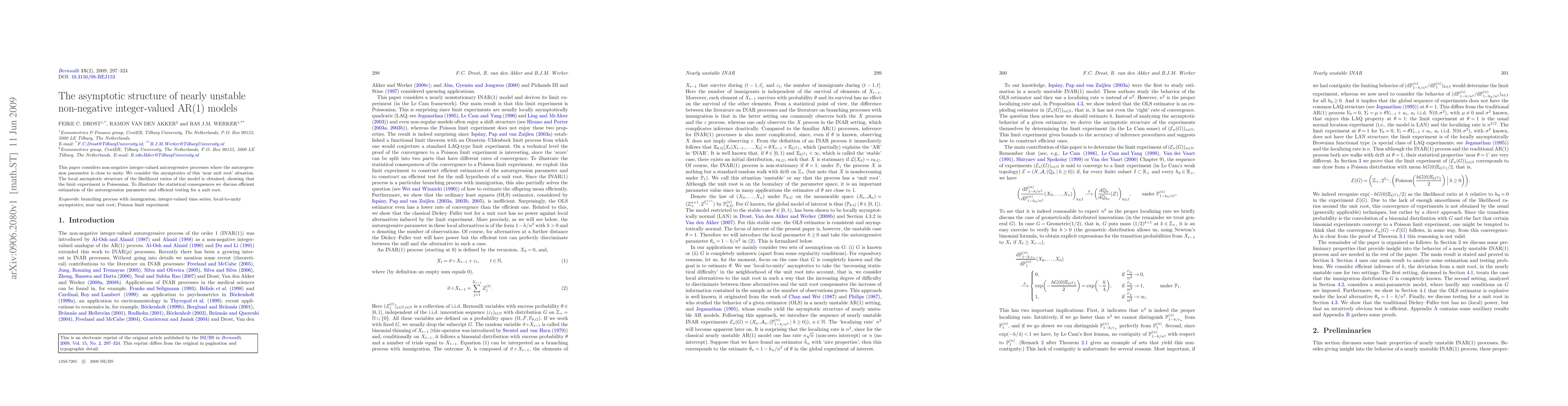 This paper investigates the asymptotic behavior of non-negative integer-valued AR(1) models with an autoregression parameter near unity, deriving the local asymptotic structure of likelihood ratios and demonstrating that the limit experiment is Poissonian. It also discusses efficient estimation and testing for a unit root in this context.