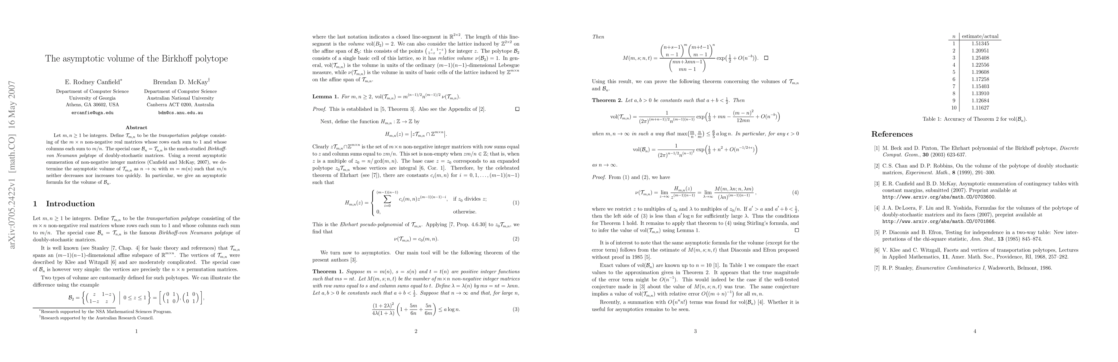 This paper determines the asymptotic volume of the transportation polytope T(m,n) as n approaches infinity, with m/n remaining bounded. It also provides an asymptotic formula for the volume of the Birkhoff-von Neumann polytope B(n), leveraging recent enumeration techniques for non-negative integer matrices.