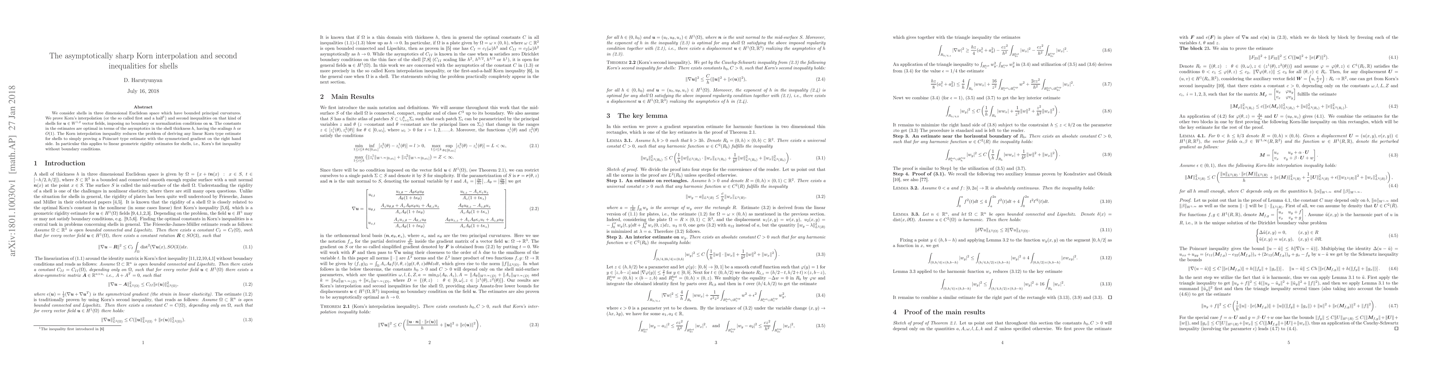 We consider shells in three dimensional Euclidean space which have bounded principal curvatures. We prove Korn's interpolation (or the so called first and a half\footnote{The inequality first introduced in [6]}) and second inequalities on that kind of shells for $\Bu\in W^{1,2}$ vector fields, imposing no boundary or normalization conditions on $\Bu.$ The constants in the estimates are optimal in terms of the asymptotics in the shell thickness $h,$ having the scalings $h$ or $O(1).$ The Korn interpolation inequality reduces the problem of deriving any linear Korn type estimate for shells to simply proving a Poincar\'e type estimate with the symmetrized gradient on the right hand side. In particular this applies to linear geometric rigidity estimates for shells, i.e., Korn's fist inequality without boundary conditions.