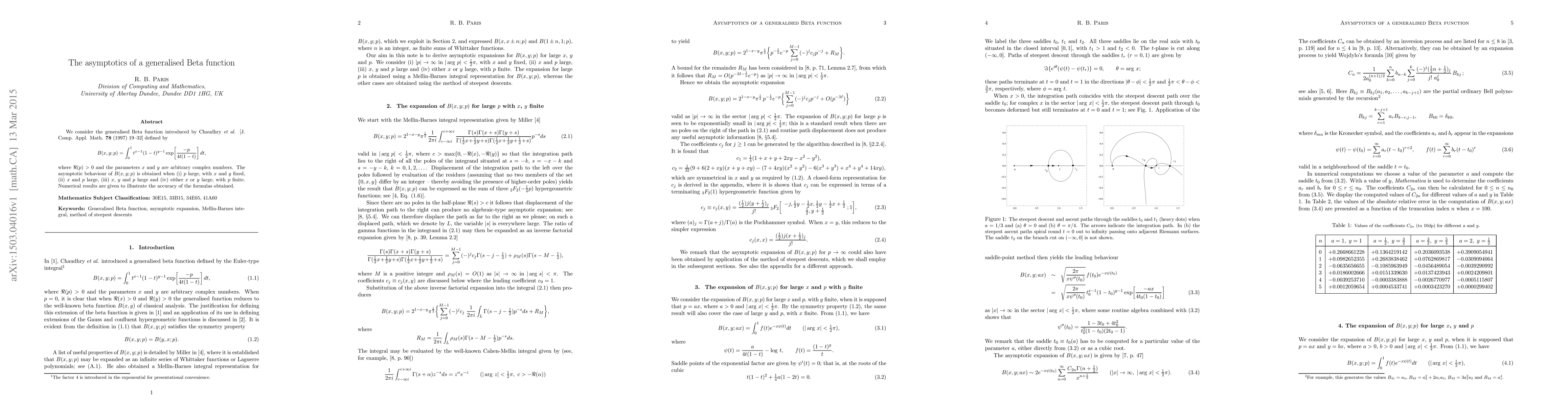 We consider the generalised Beta function introduced by Chaudhry {\it et al.\/} [J. Comp. Appl. Math. {\bf 78} (1997) 19--32] defined by \[B(x,y;p)=\int_0^1 t^{x-1} (1-t)^{y-1} \exp \left[\frac{-p}{4t(1-t)}\right]\,dt,\] where $\Re (p)>0$ and the parameters $x$ and $y$ are arbitrary complex numbers. The asymptotic behaviour of $B(x,y;p)$ is obtained when (i) $p$ large, with $x$ and $y$ fixed, (ii) $x$ and $p$ large, (iii) $x$, $y$ and $p$ large and (iv) either $x$ or $y$ large, with $p$ finite. Numerical results are given to illustrate the accuracy of the formulas obtained.