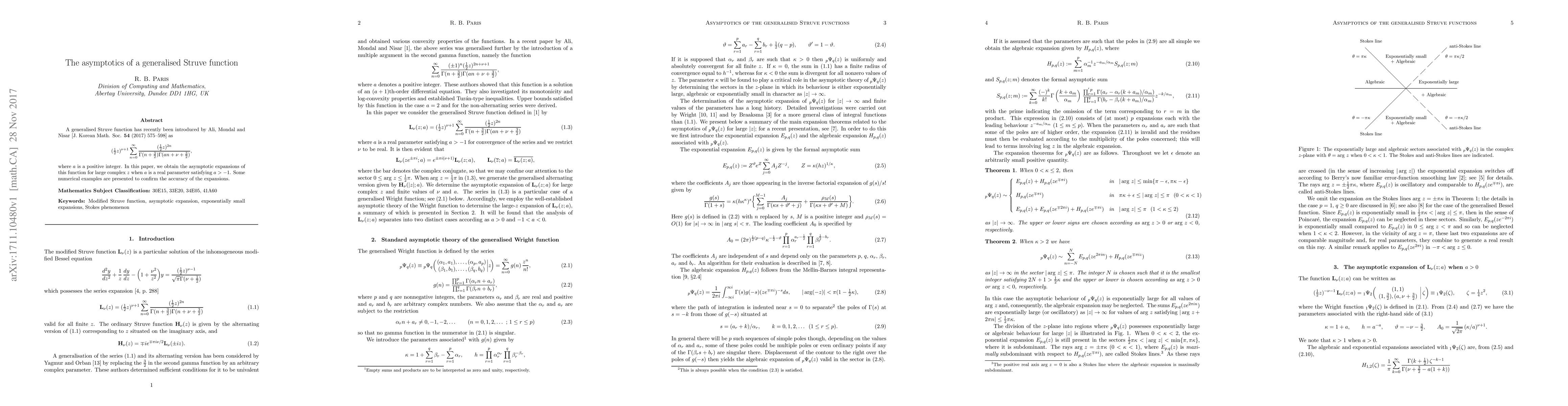 A generalised Struve function has recently been introduced by Ali, Mondal and Nisar [J. Korean Math. Soc. {\bf 54} (2017) 575--598] as \[(\frac{1}{2} z)^{\nu+1}\sum_{n=0}^\infty\frac{(\frac{1}{2} z)^{2n}}{\Gamma(n+\frac{3}{2}) \Gamma(an+\nu+\frac{3}{2})},\] where $a$ is a positive integer. In this paper, we obtain the asymptotic expansions of this function for large complex $z$ when $a$ is a real parameter satisfying $a>-1$. Some numerical examples are presented to confirm the accuracy of the expansions.