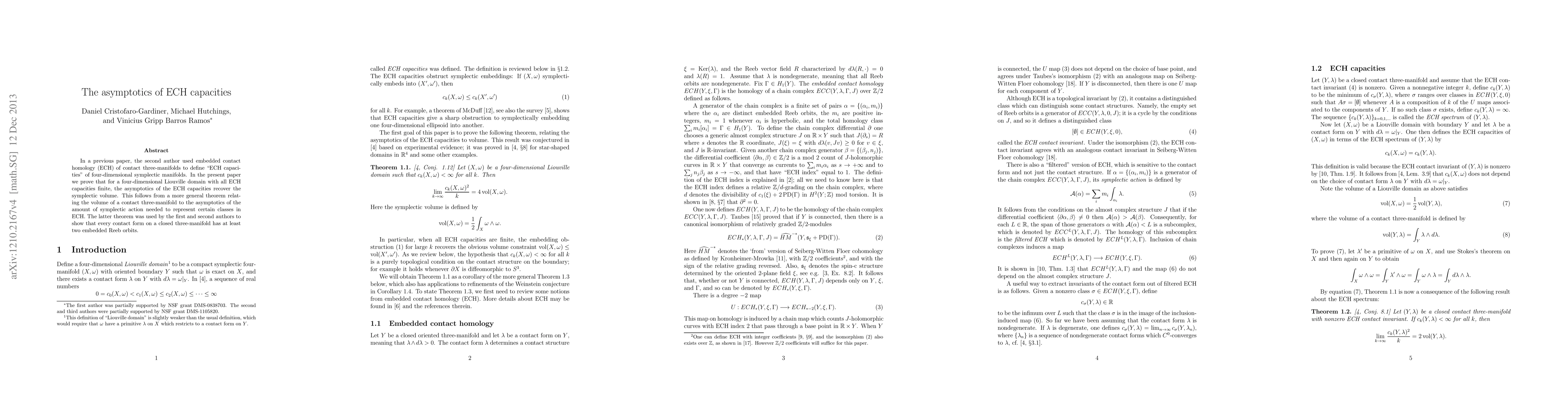 In a previous paper, the second author used embedded contact homology (ECH) of contact three-manifolds to define "ECH capacities" of four-dimensional symplectic manifolds. In the present paper we prove that for a four-dimensional Liouville domain with all ECH capacities finite, the asymptotics of the ECH capacities recover the symplectic volume. This follows from a more general theorem relating the volume of a contact three-manifold to the asymptotics of the amount of symplectic action needed to represent certain classes in ECH. The latter theorem was used by the first and second authors to show that every contact form on a closed three-manifold has at least two embedded Reeb orbits.