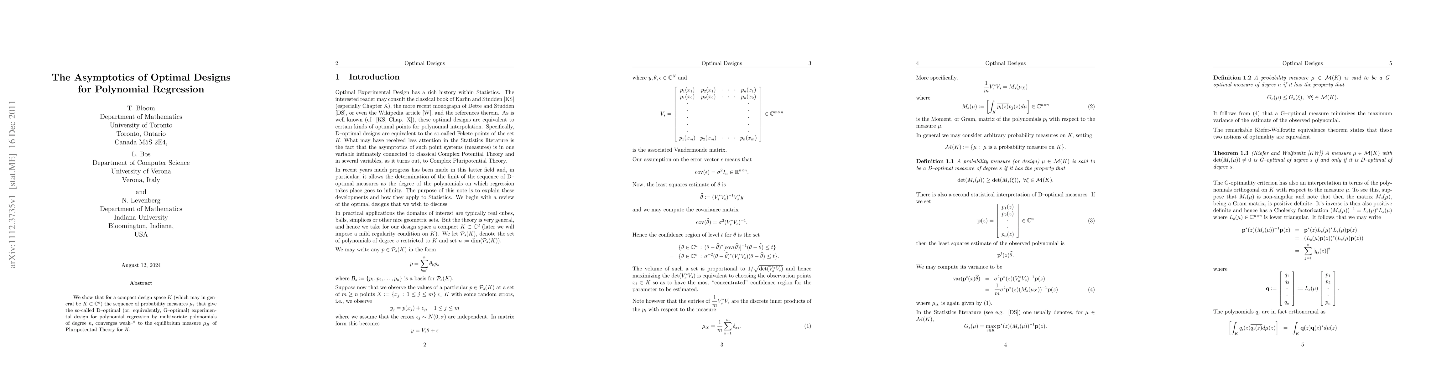 This paper explores the asymptotics of optimal designs for polynomial regression, finding key information about D-optimal designs on compact design spaces. It provides new insights into the behavior of optimal designs as sample sizes increase.