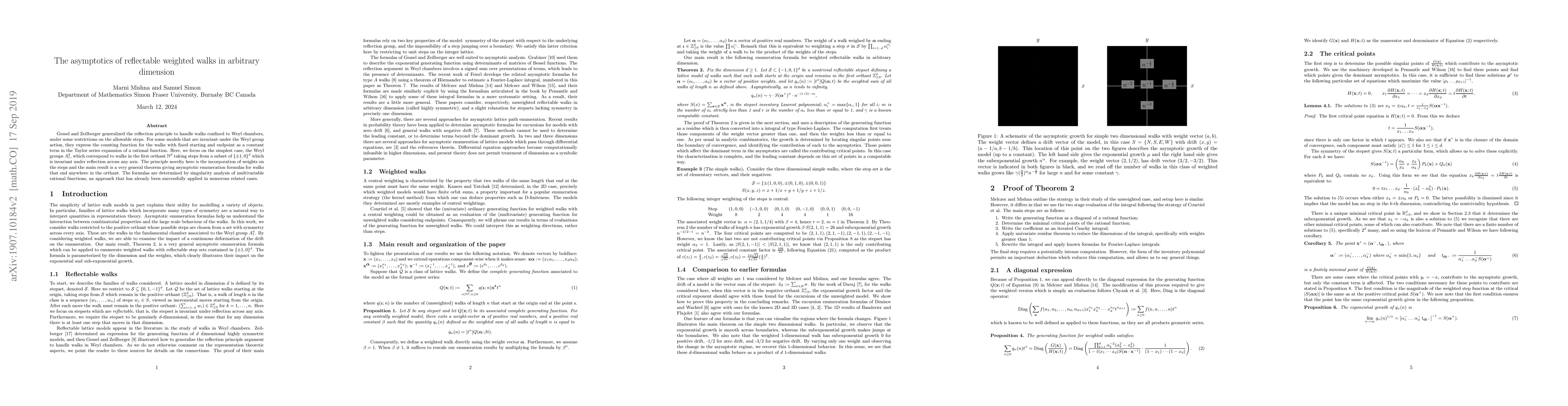 This paper extends the reflection principle to weighted walks in the first orthant, focusing on the Weyl group $A_1^d$. It provides asymptotic enumeration formulas for these walks using singularity analysis of multivariable rational functions.