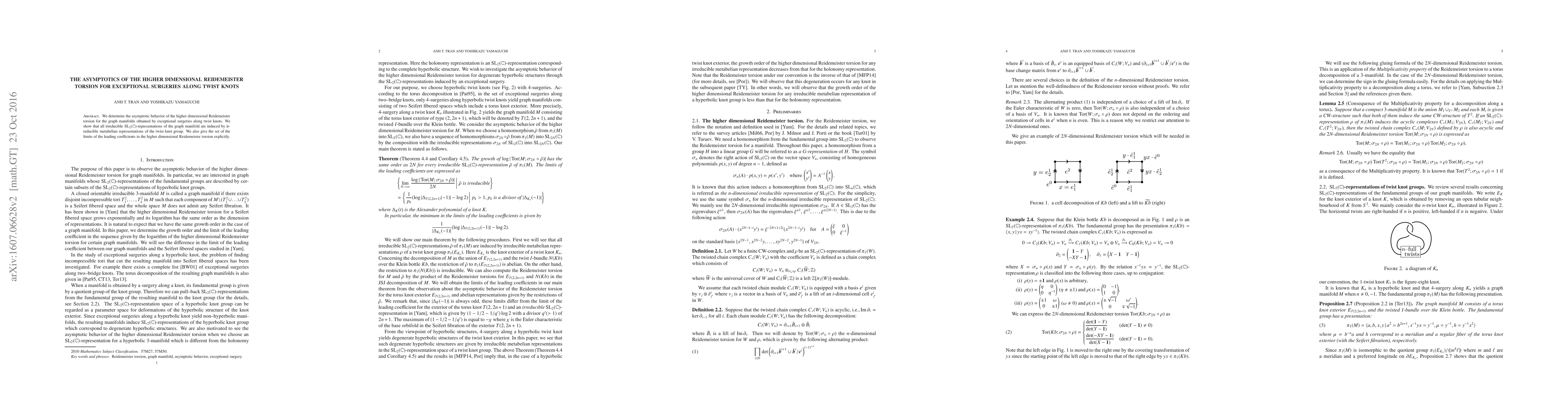 This paper investigates the asymptotic behavior of higher dimensional Reidemeister torsion for graph manifolds formed via exceptional surgeries along twist knots, demonstrating that the irreducible SL(2;C) representations of these manifolds arise from irreducible metabelian representations of the twist knot group, and explicitly provides the limits of the leading coefficients in the torsion.