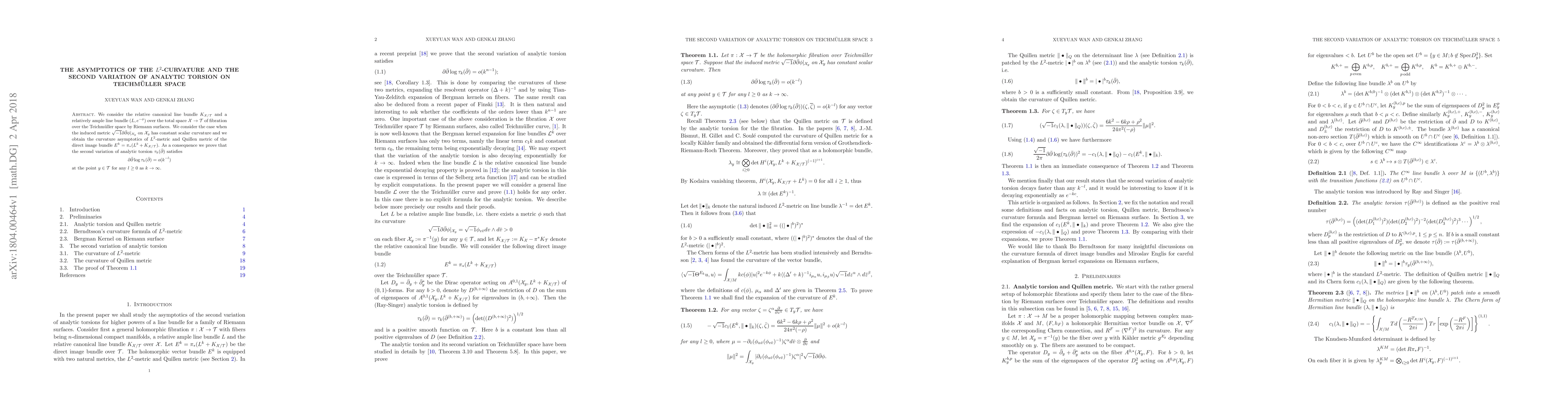 This paper investigates the $L^2$-curvature and second variation of analytic torsion for a fibration over Teichmüller space, revealing the asymptotic behavior of the $L^2$-metric and Quillen metric. It concludes that the second variation of analytic torsion diminishes as $k^{-l}$ for large $k,$ where $l \geq 0$.