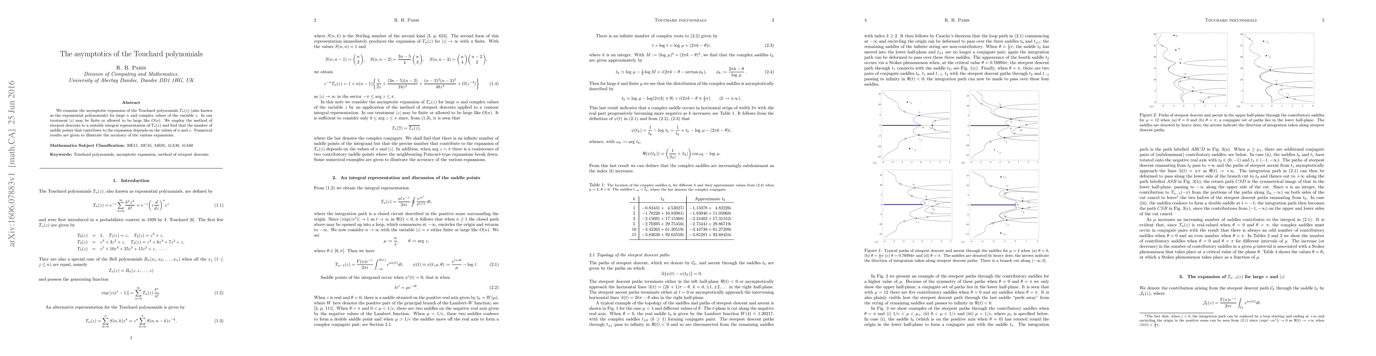 Researchers used the method of steepest descents to study the asymptotic expansion of Touchard polynomials for large n and complex z values. They found that the number of saddle points contributing to the expansion depends on n and z.