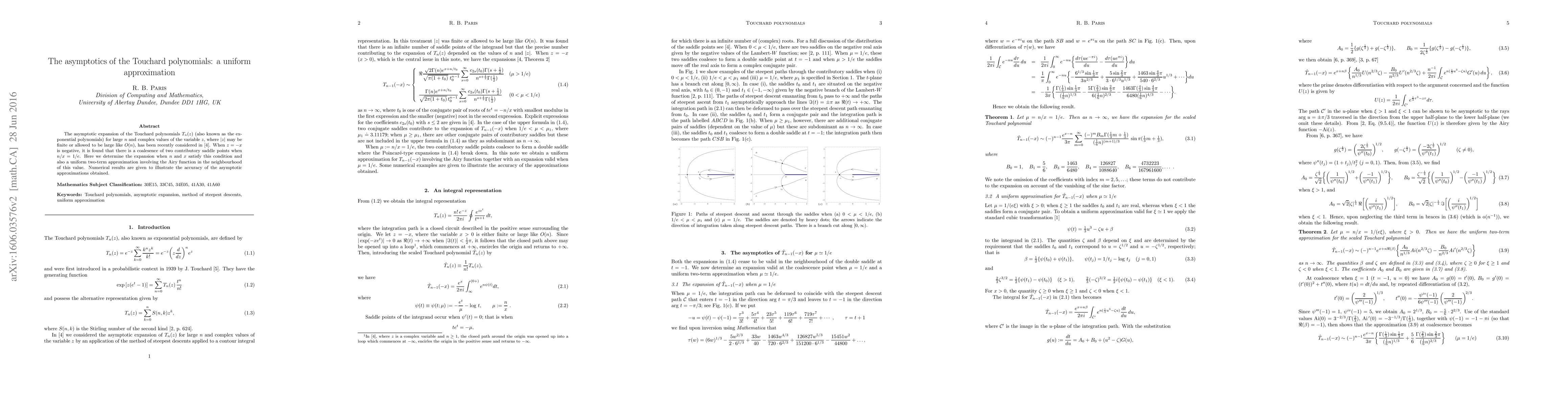 Researchers found a two-term approximation of the Touchard polynomials using the Airy function when n/x = 1/e, offering improved accuracy in large n and complex z values.