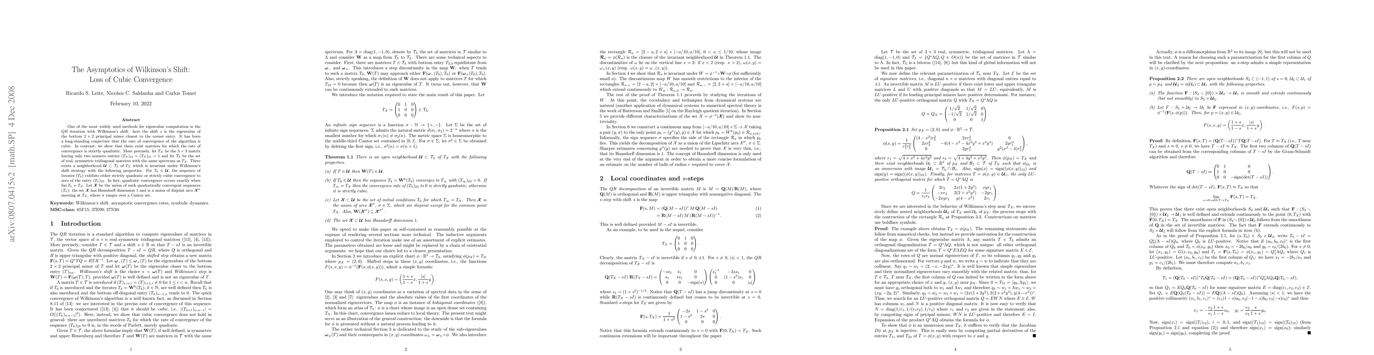 One of the most widely used methods for eigenvalue computation is the $QR$ iteration with Wilkinson's shift: here the shift $s$ is the eigenvalue of the bottom $2\times 2$ principal minor closest to the corner entry. It has been a long-standing conjecture that the rate of convergence of the algorithm is cubic. In contrast, we show that there exist matrices for which the rate of convergence is strictly quadratic. More precisely, let $T_X$ be the $3 \times 3$ matrix having only two nonzero entries $(T_X)_{12} = (T_X)_{21} = 1$ and let $T_L$ be the set of real, symmetric tridiagonal matrices with the same spectrum as $T_X$. There exists a neighborhood $U \subset T_L$ of $T_X$ which is invariant under Wilkinson's shift strategy with the following properties. For $T_0 \in U$, the sequence of iterates $(T_k)$ exhibits either strictly quadratic or strictly cubic convergence to zero of the entry $(T_k)_{23}$. In fact, quadratic convergence occurs exactly when $\lim T_k = T_X$. Let $X$ be the union of such quadratically convergent sequences $(T_k)$: the set $X$ has Hausdorff dimension 1 and is a union of disjoint arcs $X^\sigma$ meeting at $T_X$, where $\sigma$ ranges over a Cantor set.