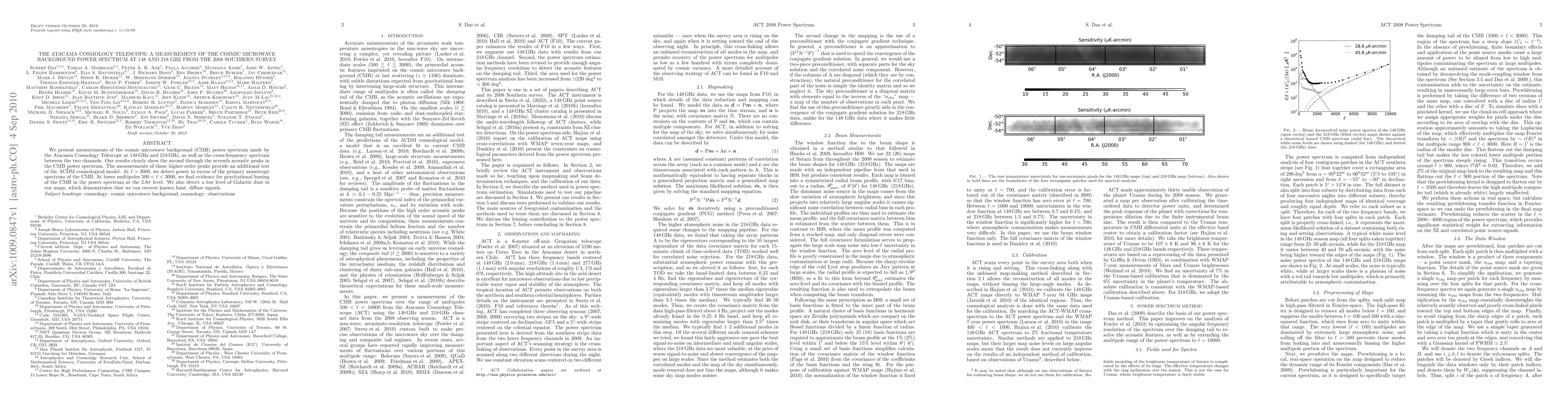 The Atacama Cosmology Telescope measured the cosmic microwave background power spectrum at 148 GHz and 218 GHz, detecting higher-order acoustic peaks and evidence of gravitational lensing, while also revealing low levels of Galactic dust in the maps.