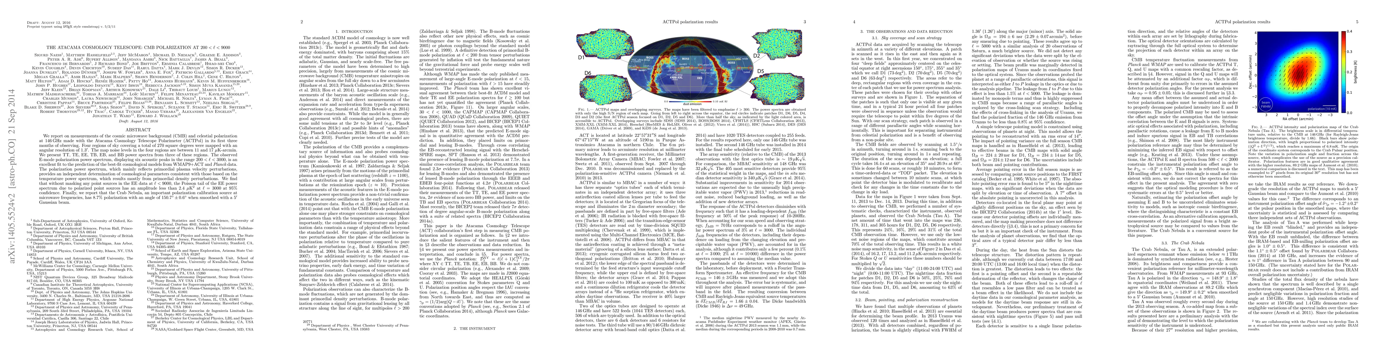 We report on measurements of the cosmic microwave background (CMB) and celestial polarization at 146 GHz made with the Atacama Cosmology Telescope Polarimeter (ACTPol) in its first three months of observing. Four regions of sky covering a total of 270 square degrees were mapped with an angular resolution of $1.3'$. The map noise levels in the four regions are between 11 and 17 $\mu$K-arcmin. We present TT, TE, EE, TB, EB, and BB power spectra from three of these regions. The observed E-mode polarization power spectrum, displaying six acoustic peaks in the range $200<\ell<3000$, is an excellent fit to the prediction of the best-fit cosmological models from WMAP9+ACT and Planck data. The polarization power spectrum, which mainly reflects primordial plasma velocity perturbations, provides an independent determination of cosmological parameters consistent with those based on the temperature power spectrum, which results mostly from primordial density perturbations. We find that without masking any point sources in the EE data at $\ell<9000$, the Poisson tail of the EE power spectrum due to polarized point sources has an amplitude less than $2.4$ $\mu$K$^2$ at $\ell = 3000$ at 95\% confidence. Finally, we report that the Crab Nebula, an important polarization calibration source at microwave frequencies, has 8.7\% polarization with an angle of $150.7^\circ \pm 0.6^\circ$ when smoothed with a $5'$ Gaussian beam.