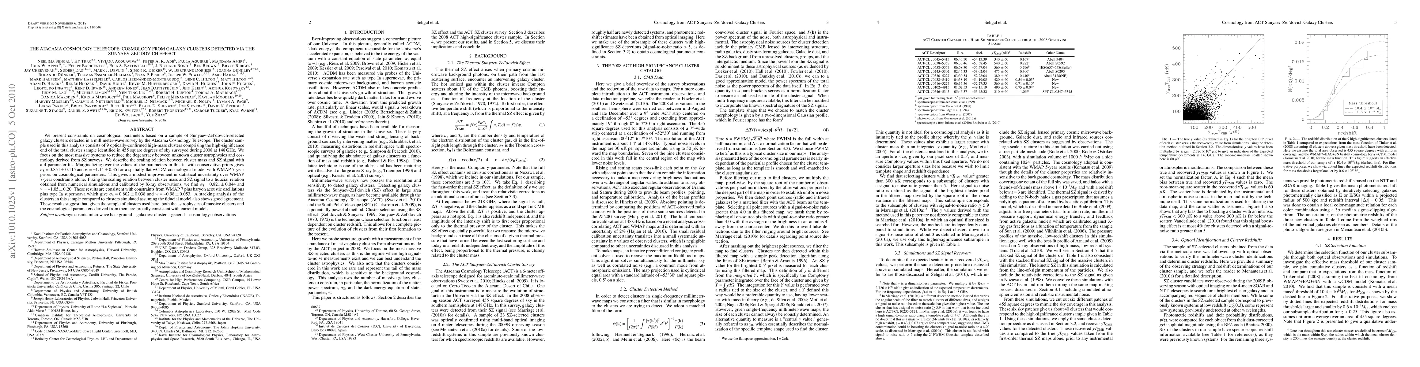 The Atacama Cosmology Telescope's Sunyaev-Zel'dovich-selected galaxy cluster analysis yields cosmological parameters sigma_8 = 0.851 +/- 0.115 and w = -1.14 +/- 0.35, showing modest improvement over WMAP 7-year constraints. Fixed scaling relations yield tighter sigma_8 = 0.821 +/- 0.044 and w = -1.05 +/- 0.20, consistent with WMAP 7 plus other observational constraints.