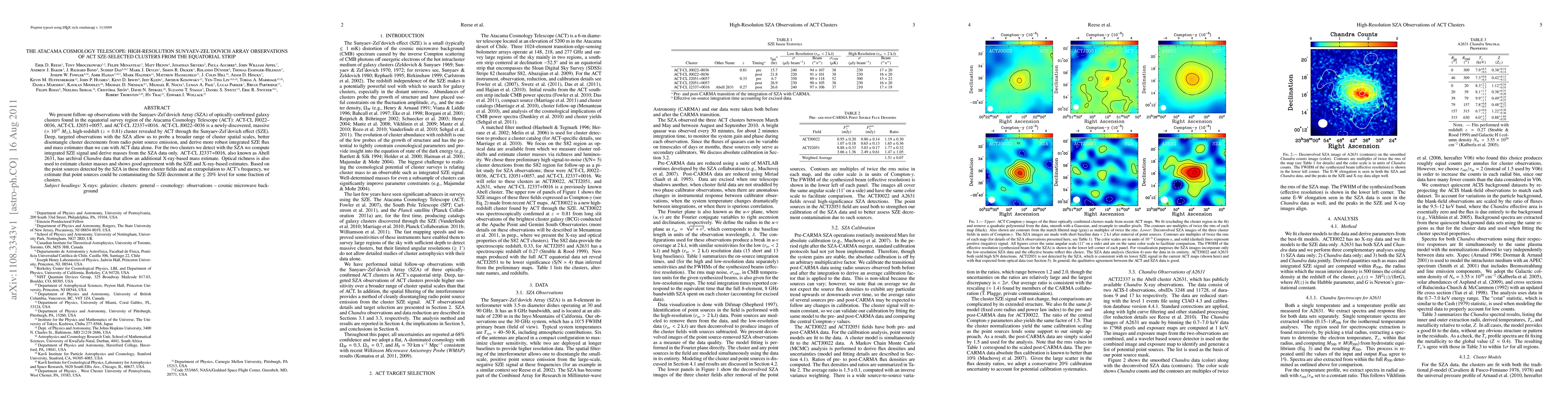 We present follow-up observations with the Sunyaev-Zel'dovich Array (SZA) of optically-confirmed galaxy clusters found in the equatorial survey region of the Atacama Cosmology Telescope (ACT): ACT-CL J0022-0036, ACT-CL J2051+0057, and ACT-CL J2337+0016. ACT-CL J0022-0036 is a newly-discovered, massive (10^15 Msun), high-redshift (z=0.81) cluster revealed by ACT through the Sunyaev-Zel'dovich effect (SZE). Deep, targeted observations with the SZA allow us to probe a broader range of cluster spatial scales, better disentangle cluster decrements from radio point source emission, and derive more robust integrated SZE flux and mass estimates than we can with ACT data alone. For the two clusters we detect with the SZA we compute integrated SZE signal and derive masses from the SZA data only. ACT-CL J2337+0016, also known as Abell 2631, has archival Chandra data that allow an additional X-ray-based mass estimate. Optical richness is also used to estimate cluster masses and shows good agreement with the SZE and X-ray-based estimates. Based on the point sources detected by the SZA in these three cluster fields and an extrapolation to ACT's frequency, we estimate that point sources could be contaminating the SZE decrement at the <= 20% level for some fraction of clusters.