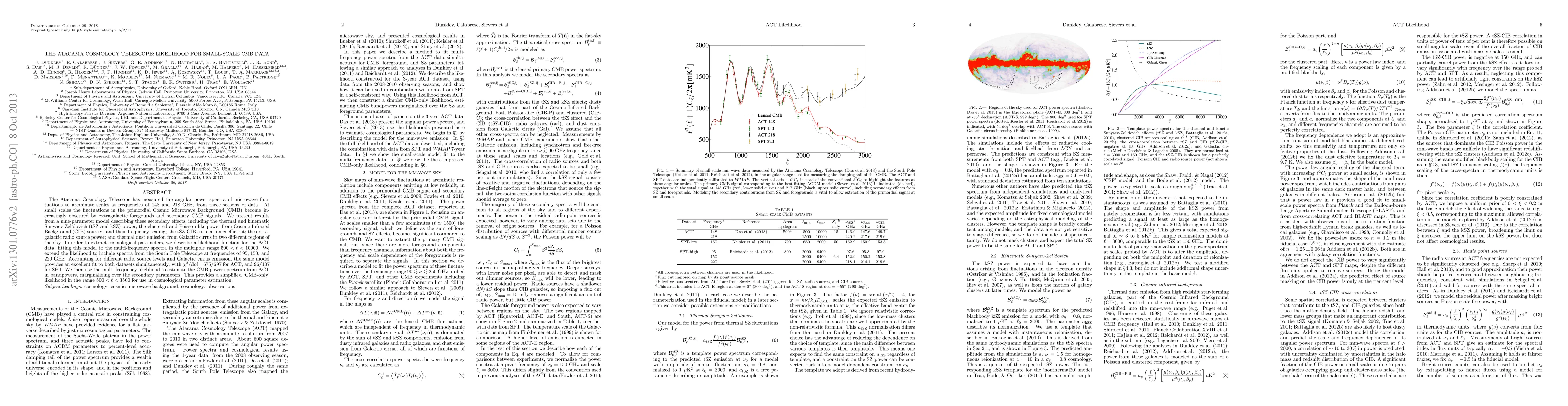 The Atacama Cosmology Telescope (ACT) measures microwave fluctuations at small scales, fitting a nine-parameter model to account for extragalactic foregrounds and secondary CMB signals. The model provides an excellent fit to ACT and South Pole Telescope data, enabling the estimation of the CMB power spectrum in the multipole range 500<ell<3500 for cosmological parameter estimation.