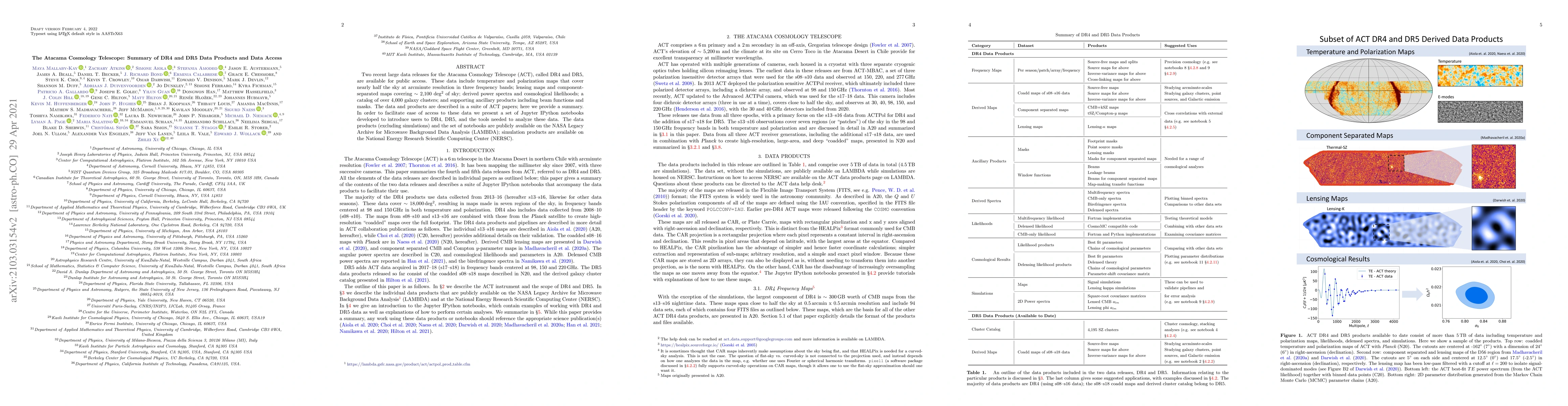 The Atacama Cosmology Telescope's DR4 and DR5 data releases provide public access to temperature and polarization maps, lensing maps, and a catalog of galaxy clusters, among other products. These data are accessible via Jupyter notebooks and are hosted on the NASA LAMBDA archive, with simulations available on the NERSC.