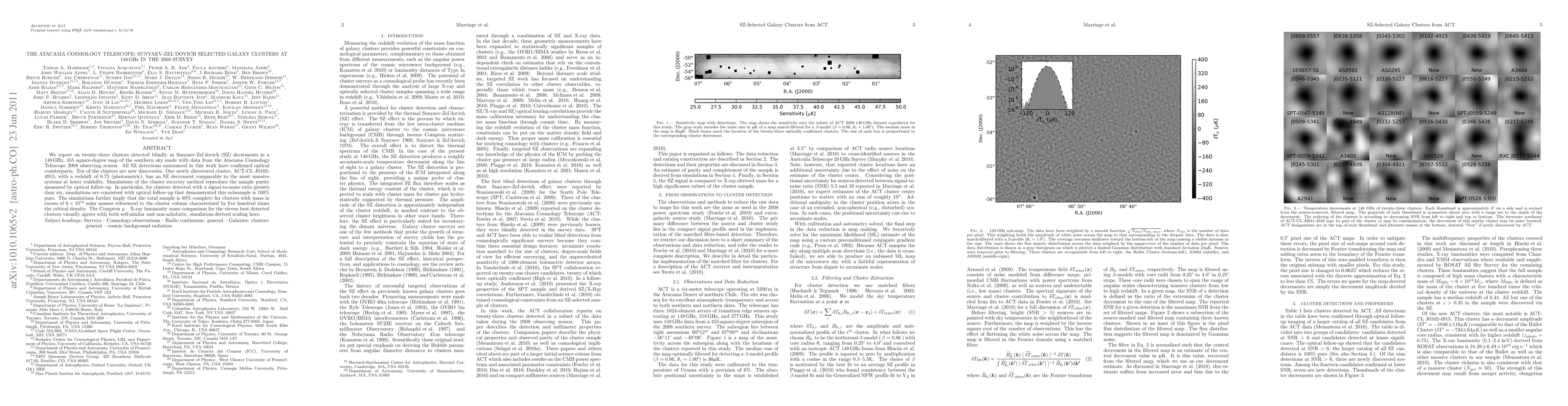 The Atacama Cosmology Telescope's 2008 survey detected twenty-three galaxy clusters via Sunyaev-Zel'dovich effect at 148 GHz, including ten new discoveries. One newly found cluster, ACT-CL J0102-4915, shows significant SZ decrement and is comparable to the most massive systems at lower redshifts.