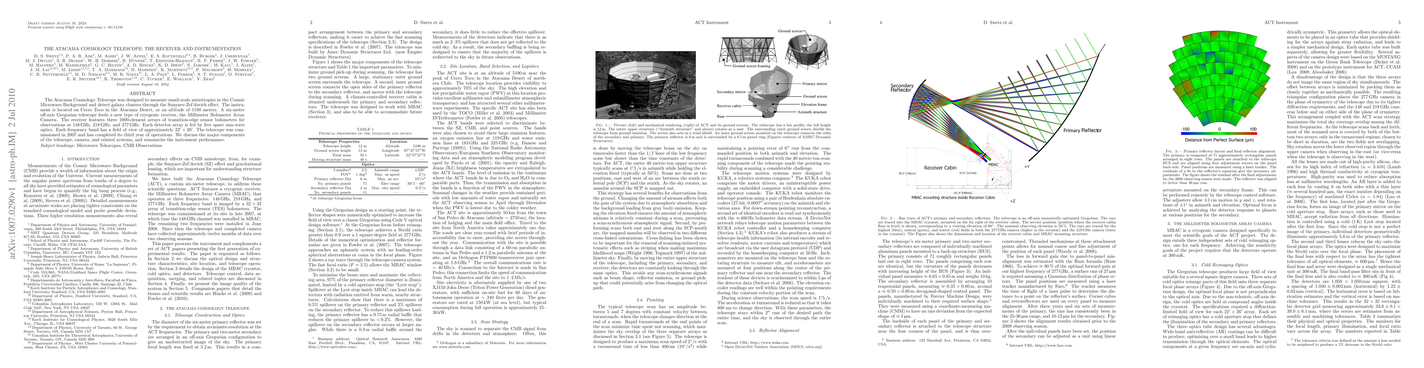 The Atacama Cosmology Telescope, located in the Atacama Desert, uses a six-meter telescope and a cryogenic Millimeter Bolometer Array Camera to measure Cosmic Microwave Background anisotropies and detect galaxy clusters via the Sunyaev-Zel'dovich effect. The instrument features three bolometer arrays operating at 148, 218, and 277 GHz.