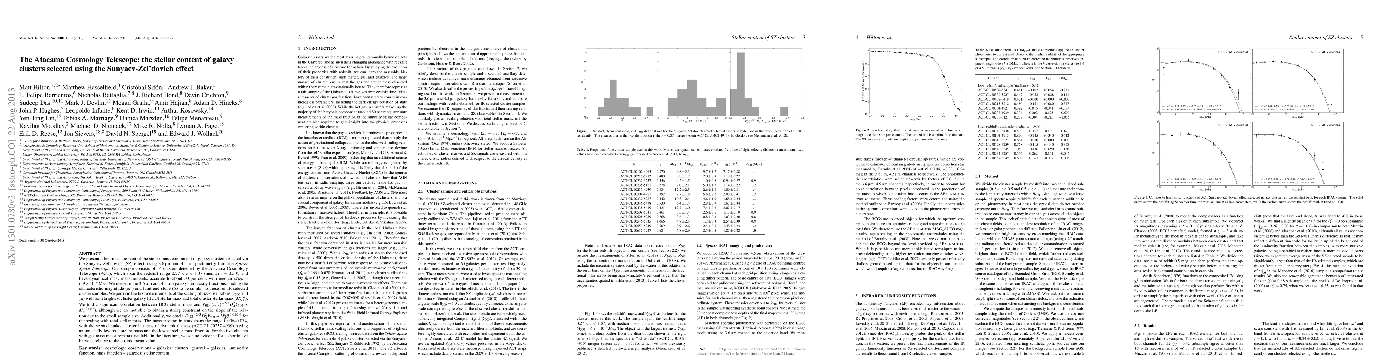 We present a first measurement of the stellar mass component of galaxy clusters selected via the Sunyaev-Zel'dovich (SZ) effect, using 3.6 um and 4.5 um photometry from the Spitzer Space Telescope. Our sample consists of 14 clusters detected by the Atacama Cosmology Telescope (ACT), which span the redshift range 0.27 < z < 1.07 (median z = 0.50), and have dynamical mass measurements, accurate to about 30 per cent, with median M500 = 6.9 x 10^{14} MSun. We measure the 3.6 um and 4.5 um galaxy luminosity functions, finding the characteristic magnitude (m*) and faint-end slope (alpha) to be similar to those for IR-selected cluster samples. We perform the first measurements of the scaling of SZ-observables (Y500 and y0) with both brightest cluster galaxy (BCG) stellar mass and total cluster stellar mass (M500star). We find a significant correlation between BCG stellar mass and Y500 (E(z)^{-2/3} DA^2 Y500 ~ M*^{1.2 +/- 0.6}), although we are not able to obtain a strong constraint on the slope of the relation due to the small sample size. Additionally, we obtain E(z)^{-2/3} DA^2 Y500 ~ M500star^{1.0 +/- 0.6} for the scaling with total stellar mass. The mass fraction in stars spans the range 0.006-0.034, with the second ranked cluster in terms of dynamical mass (ACT-CL J0237-4939) having an unusually low total stellar mass and the lowest stellar mass fraction. For the five clusters with gas mass measurements available in the literature, we see no evidence for a shortfall of baryons relative to the cosmic mean value.