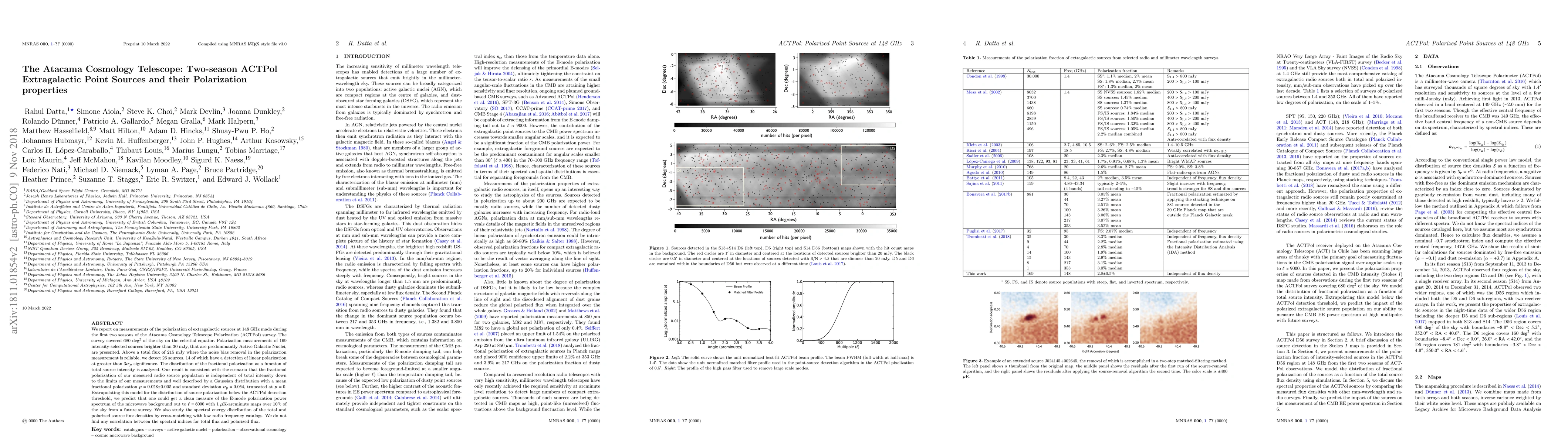This paper reports on polarization measurements of extragalactic sources at 148 GHz from the first two seasons of the ACTPol survey, revealing 26 sources with reliable polarization detections. The results suggest that the fractional polarization is independent of total intensity and follows a Gaussian distribution, which could enable future microwave background polarization studies.