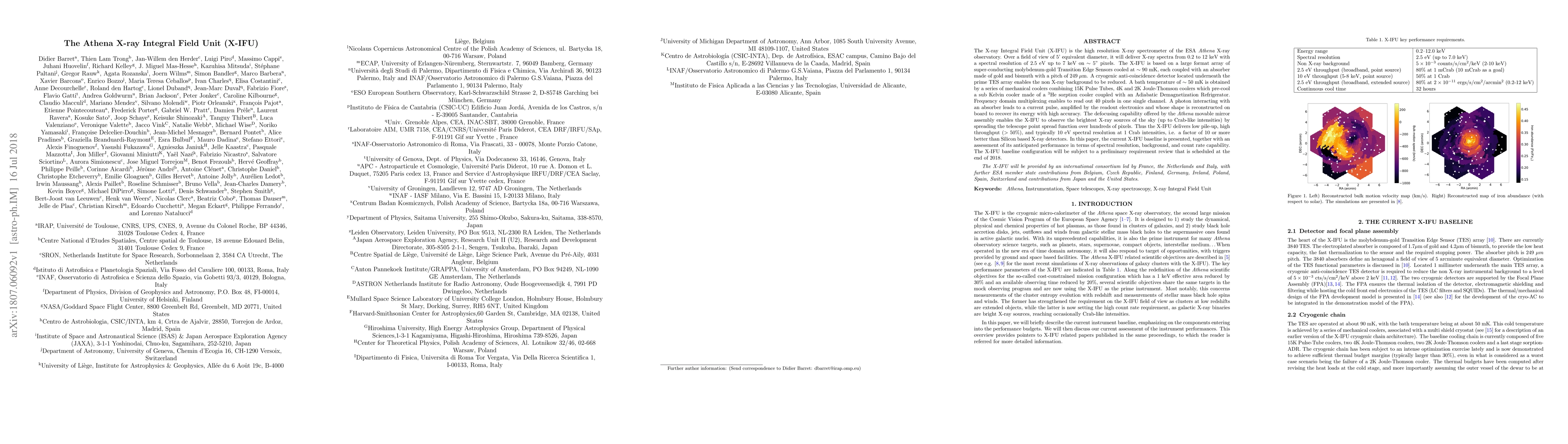 The Athena X-ray Integral Field Unit (X-IFU) is a high-resolution X-ray spectrometer designed to deliver spectra from 0.2 to 12 keV with exceptional spectral resolution, utilizing superconducting sensors and advanced cryogenics to achieve low background and high throughput. Its baseline configuration is set for a preliminary review at the end of 2018.