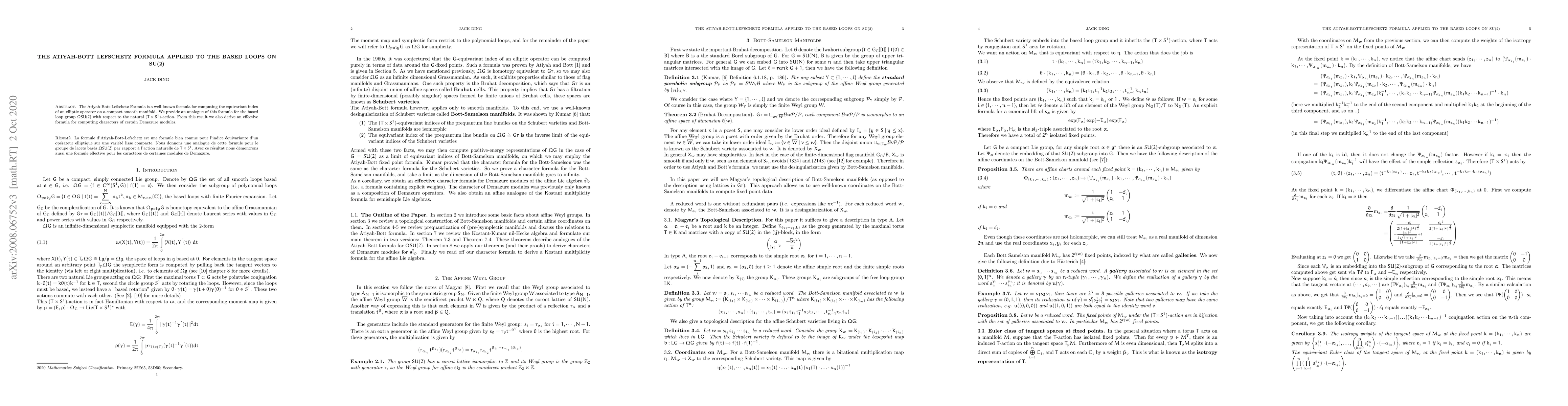 Summary: The paper applies the Atiyah-Bott Lefschetz Formula to the based loop group $\Omega SU(2)$ under the $(T \times S^1)$-action, deriving an analogue of the formula and an effective method for computing characters of specific Demazure modules.