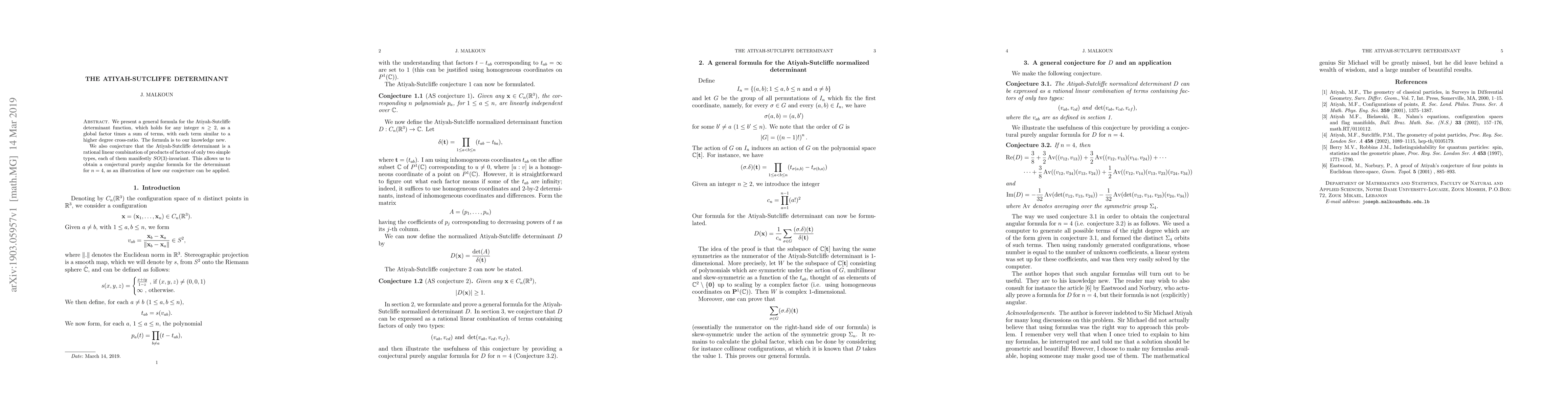 We present a general formula for the Atiyah-Sutcliffe determinant function, which holds for any integer $n \geq 2$, as a global factor times a sum of terms, with each term similar to a higher degree cross-ratio. The formula is to our knowledge new. We also conjecture that the Atiyah-Sutcliffe determinant is a rational linear combination of products of factors of only two simple types, each of them manifestly $SO(3)$-invariant. This allows us to obtain a conjectural purely angular formula for the determinant for $n=4$, as an illustration of how our conjecture can be applied.