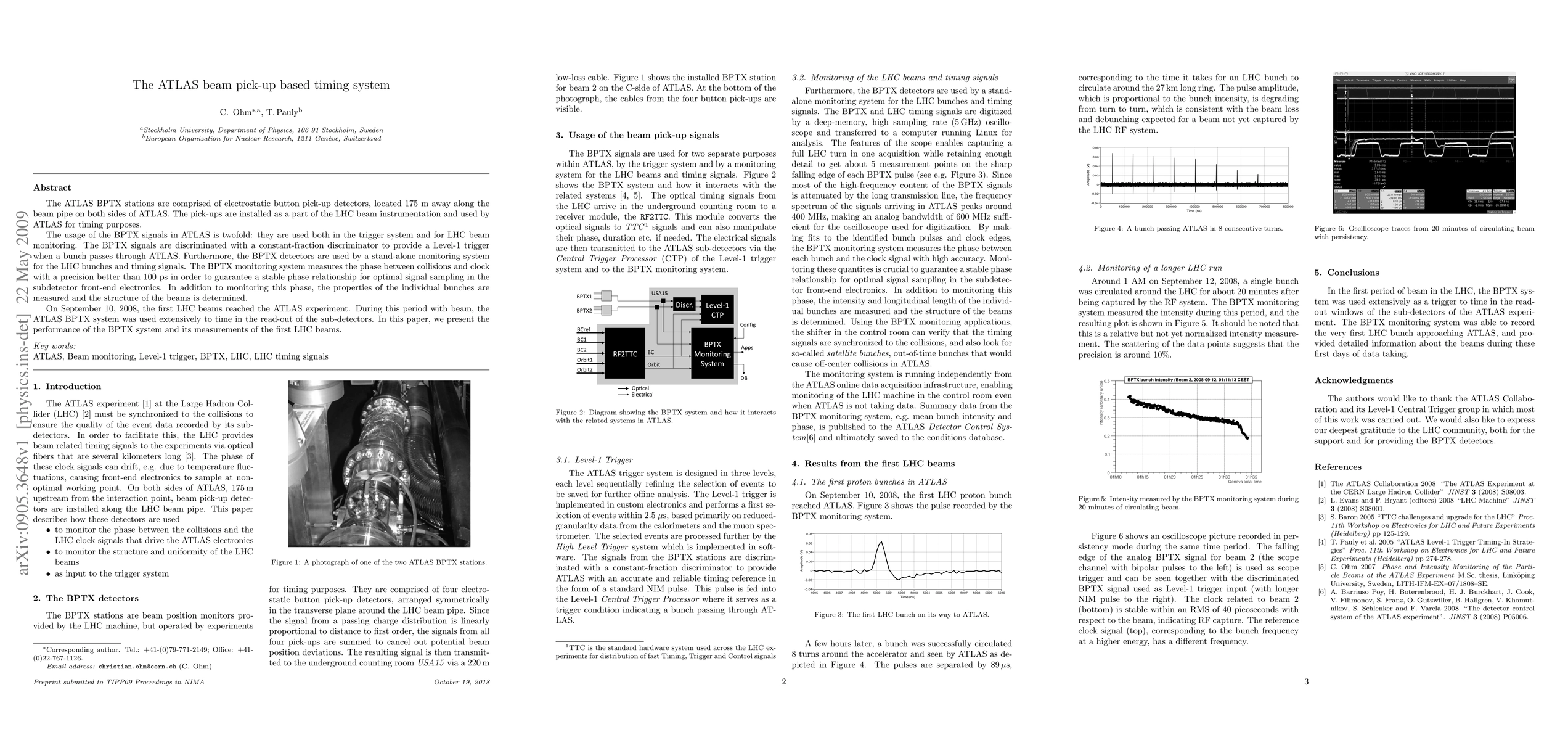 The ATLAS BPTX stations are comprised of electrostatic button pick-up detectors, located 175 m away along the beam pipe on both sides of ATLAS. The pick-ups are installed as a part of the LHC beam instrumentation and used by ATLAS for timing purposes. The usage of the BPTX signals in ATLAS is twofold: they are used both in the trigger system and for LHC beam monitoring. The BPTX signals are discriminated with a constant-fraction discriminator to provide a Level-1 trigger when a bunch passes through ATLAS. Furthermore, the BPTX detectors are used by a stand-alone monitoring system for the LHC bunches and timing signals. The BPTX monitoring system measures the phase between collisions and clock with a precision better than 100 ps in order to guarantee a stable phase relationship for optimal signal sampling in the subdetector front-end electronics. In addition to monitoring this phase, the properties of the individual bunches are measured and the structure of the beams is determined. On September 10, 2008, the first LHC beams reached the ATLAS experiment. During this period with beam, the ATLAS BPTX system was used extensively to time in the read-out of the sub-detectors. In this paper, we present the performance of the BPTX system and its measurements of the first LHC beams.
