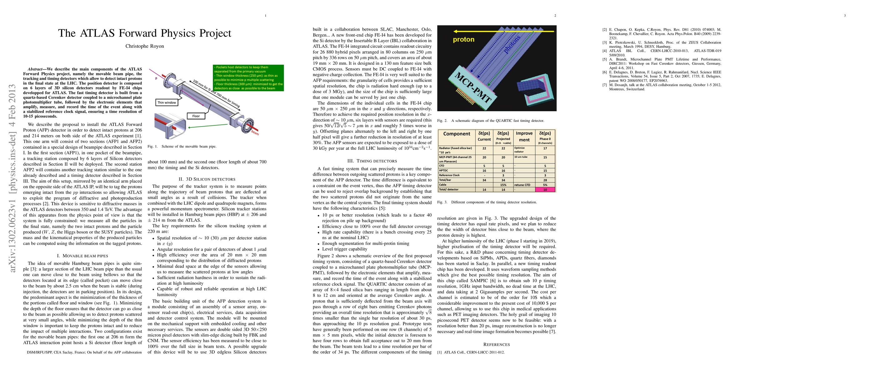 The ATLAS Forward Physics project involves movable beam pipe and advanced tracking detectors to detect intact protons in LHC final states. It utilizes 6-layer 3D silicon detectors and a quartz-based Cerenkov timing detector for precise event timing with a resolution of 10-15 picoseconds.