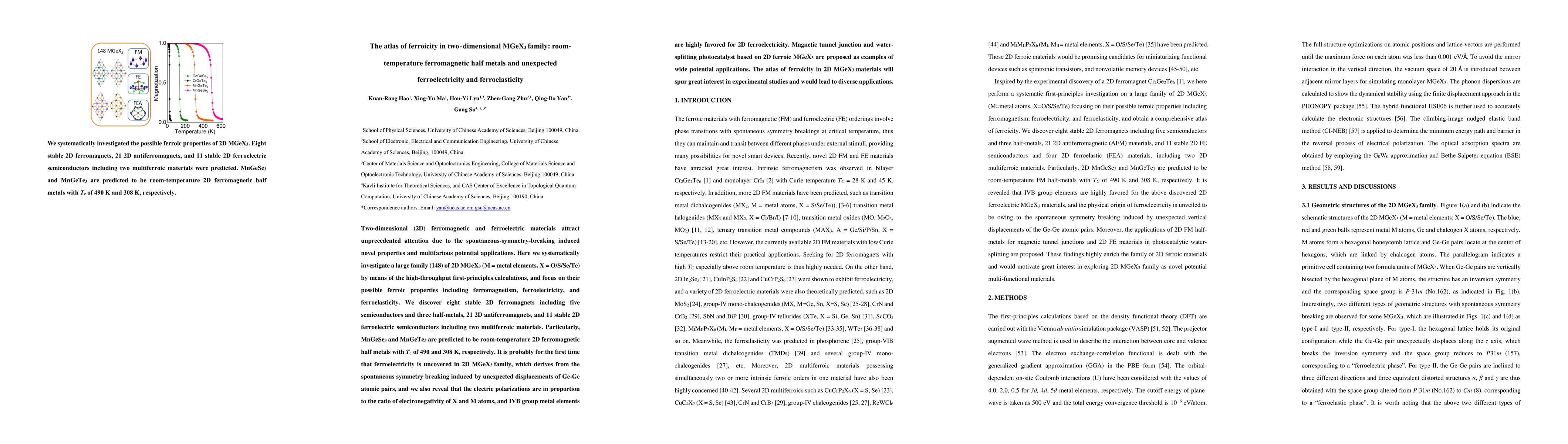 This paper systematically explores the ferroic properties of a large family of 2D MGeX3 materials, discovering eight stable ferromagnets, including five semiconductors and three room-temperature ferromagnetic half-metals, and revealing unexpected ferroelectricity and ferroelasticity in the family. Potential applications include magnetic tunnel junctions and photocatalysts.