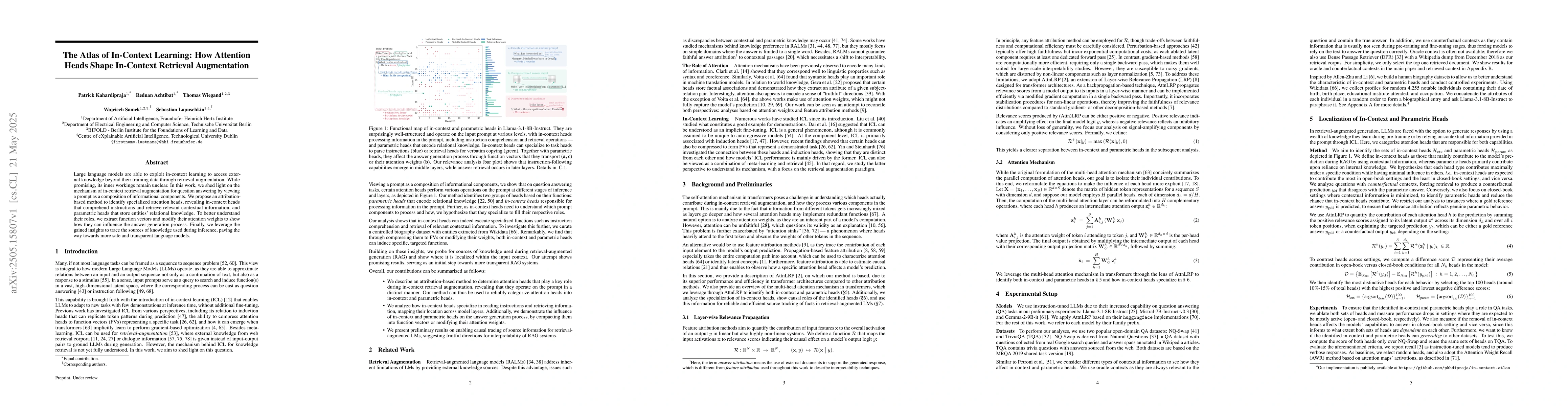 The paper introduces an attribution-based method to pinpoint specialized attention heads and their roles in in-context retrieval augmentation, along with techniques to manipulate their influence on answer generation.
