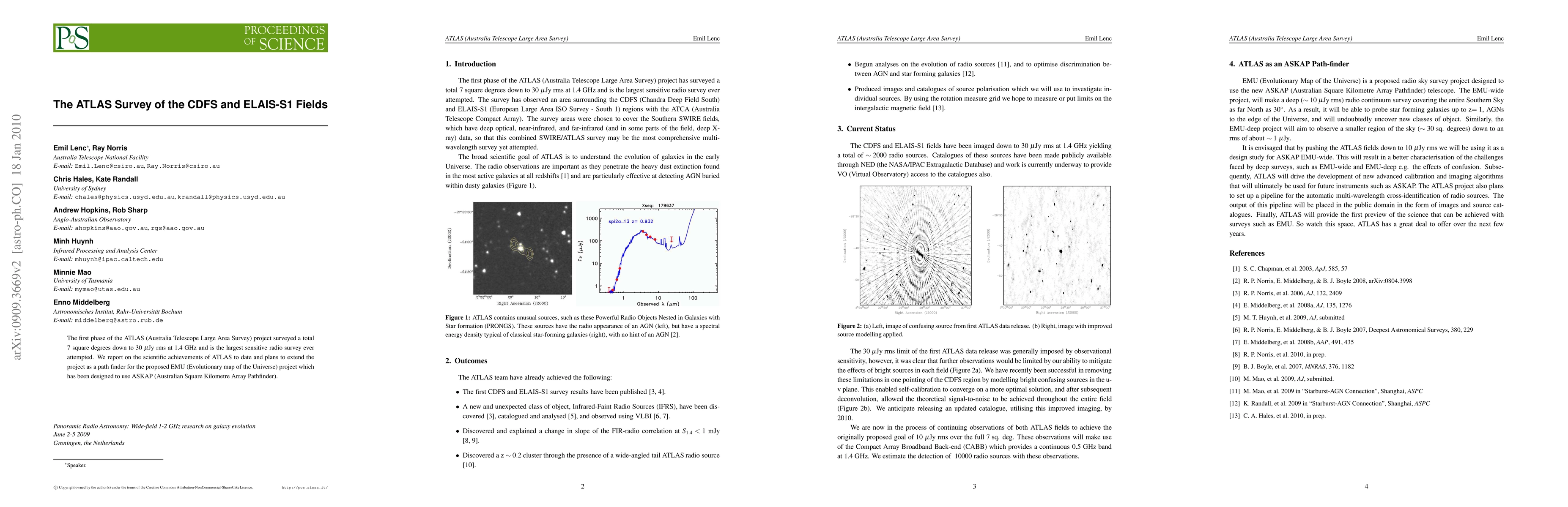 The ATLAS Survey of the CDFS and ELAIS-S1 Fields is the largest sensitive radio survey conducted to date, covering 7 square degrees down to 30 micro Jy rms at 1.4 GHz. The project aims to pave the way for the EMU, a future survey using the ASKAP telescope.