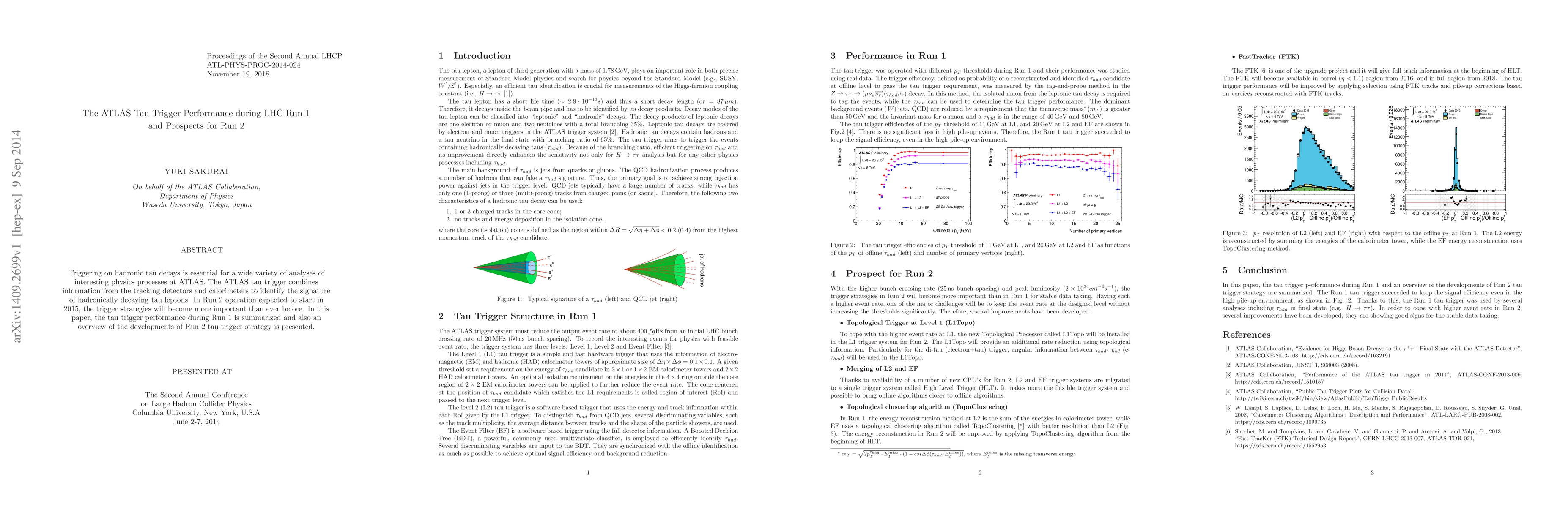 The ATLAS tau trigger's performance during Run 1 is evaluated, with key findings highlighting its efficiency in identifying hadronically decaying tau leptons. For Run 2, the trigger strategy is updated to improve performance and become more critical for various physics analyses.