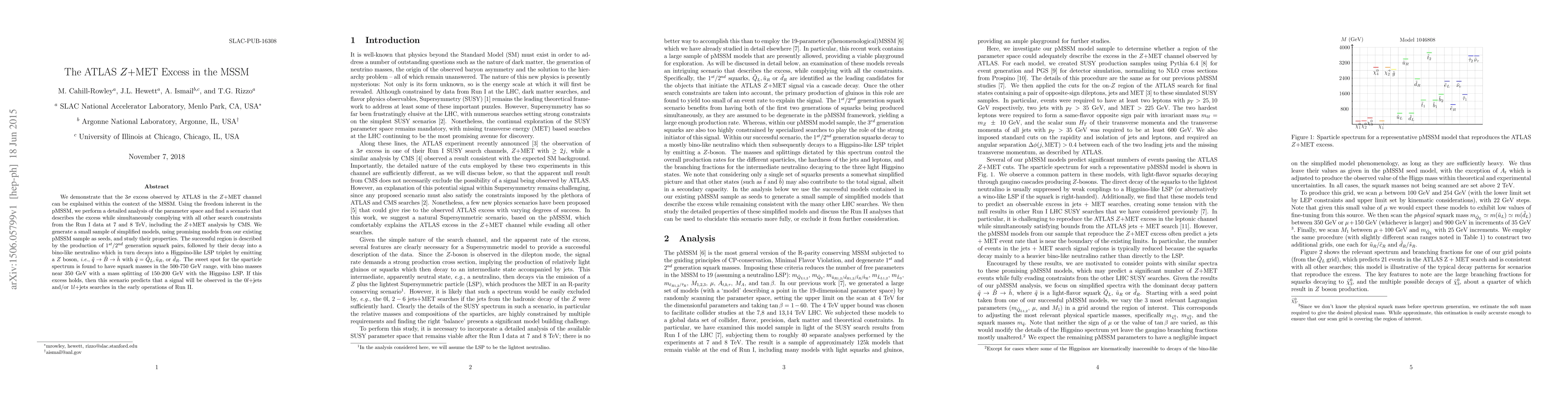 We demonstrate that the $3\sigma$ excess observed by ATLAS in the Z + MET channel can be explained within the context of the MSSM. Using the freedom inherent in the pMSSM, we perform a detailed analysis of the parameter space and find a scenario that describes the excess while simultaneously complying with all other search constraints from the Run I data at 7 and 8 TeV, including the Z + MET analysis by CMS. We generate a small sample of simplified models, using promising models from our existing pMSSM sample as seeds, and study their properties. The successful region is described by the production of 1st/2nd generation squark pairs, followed by their decay into a bino-like neutralino which in turn decays into a Higgsino-like LSP triplet by emitting a Z boson, i.e., $\tilde q\to\tilde B\to\tilde h$ with $\tilde q = \tilde Q_L,\tilde u_R,$ or $\tilde d_R$. The sweet spot for the sparticle spectrum is found to have squark masses in the 500-750 GeV range, with bino masses near 350 GeV with a mass splitting of 150-200 GeV with the Higgsino LSP. If this excess holds, then this scenario predicts that a signal will be observed in the 0l + jets and/or 1l + jets searches in the early operations of Run II.