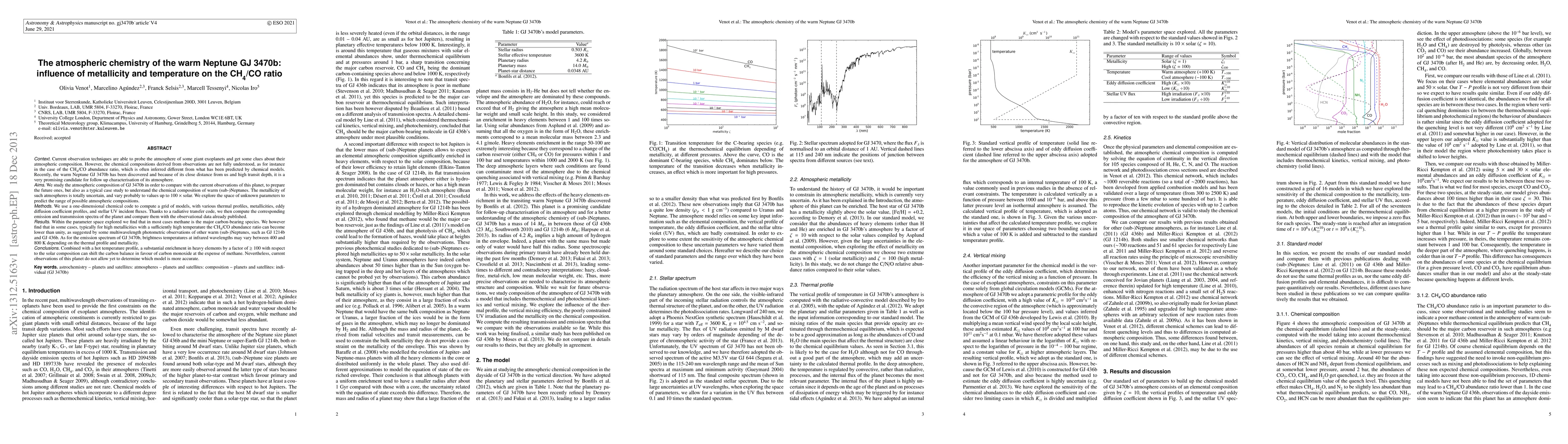 This paper investigates the atmospheric chemistry of the warm Neptune GJ 3470b, focusing on the influence of metallicity and temperature on the CH4/CO ratio. It finds that while methane is typically the dominant carbon-bearing species, high metallicity and temperature can shift the balance towards carbon monoxide, challenging current observational data.