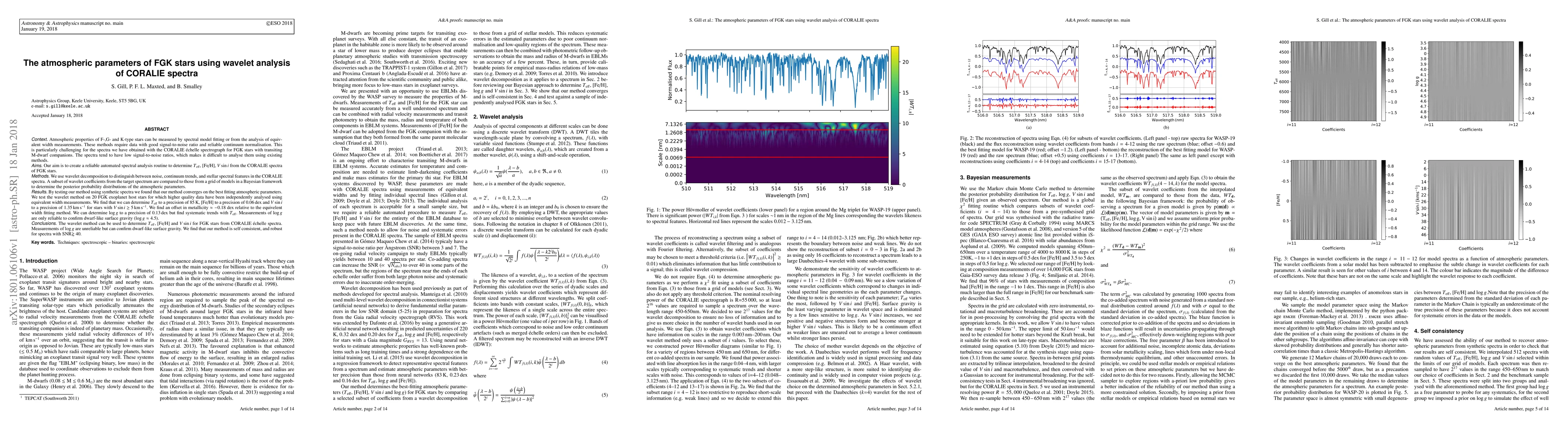 This paper develops a wavelet analysis method to determine atmospheric parameters ($T_{\rm eff}$, [Fe/H], $V \sin i$) for FGK stars using CORALIE spectra, achieving precisions of 85K, 0.06 dex, and 1.35 kms$^{-1}$ respectively, and demonstrating robustness for spectra with SNR > 40.