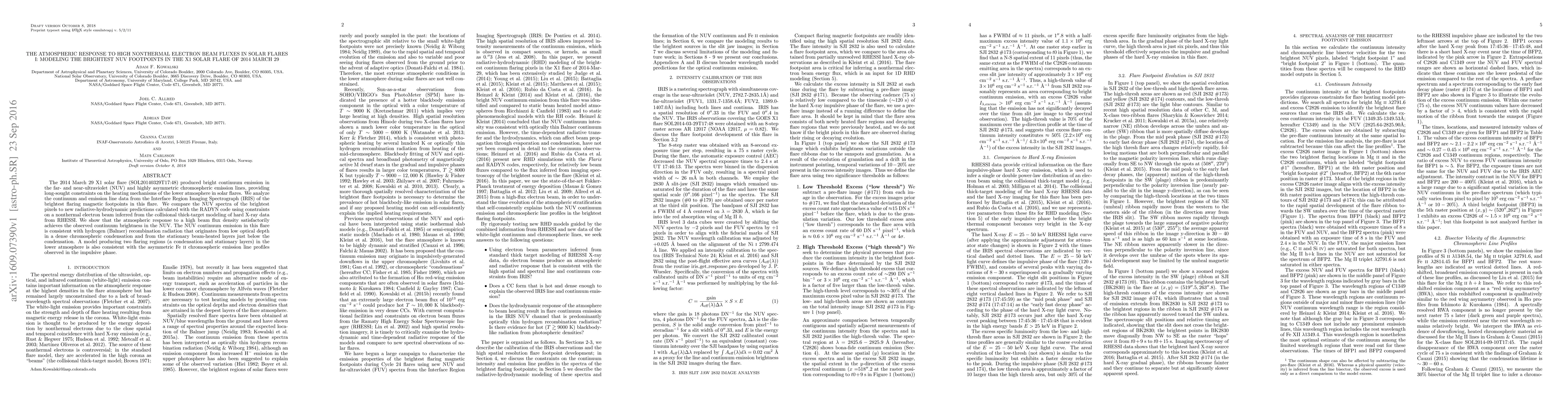 This paper investigates the atmospheric response during the 2014 March 29 X1 solar flare, focusing on the brightest NUV footpoints. It uses IRIS data and RADYN modeling to show that high nonthermal electron beam fluxes can explain the observed NUV continuum brightness, attributing it to hydrogen recombination in dense, beam-heated chromospheric layers.