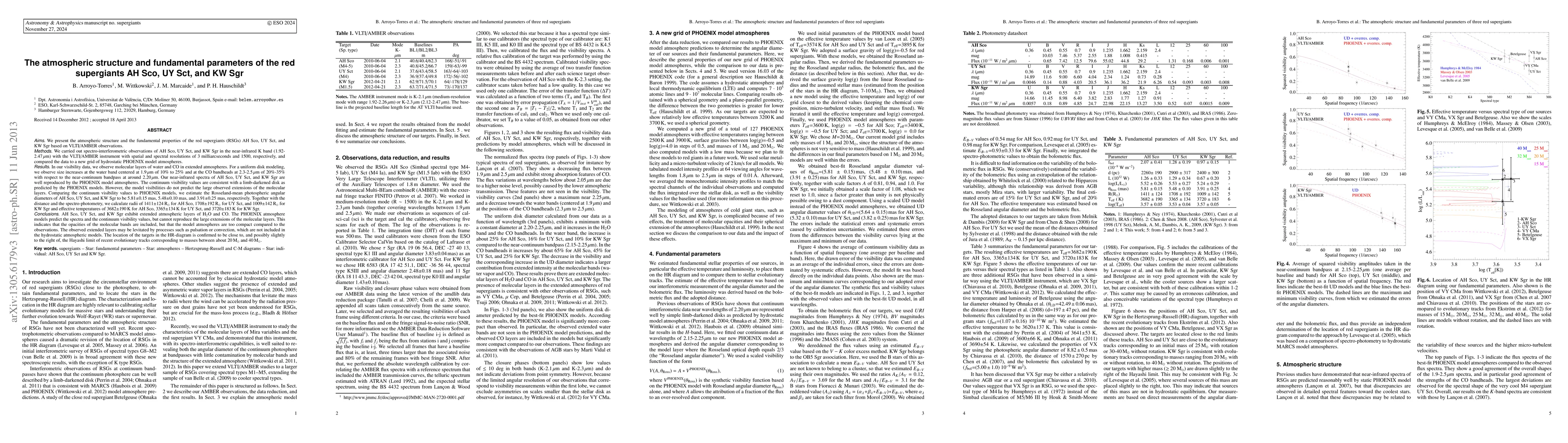 This paper investigates the atmospheric structure and fundamental parameters of the red supergiants AH Sco, UY Sct, and KW Sgr using VLTI/AMBER observations. The study reveals significant extensions in the molecular layers of water and CO, indicating that current hydrostatic models are too compact and likely miss dynamic processes like pulsation or convection.