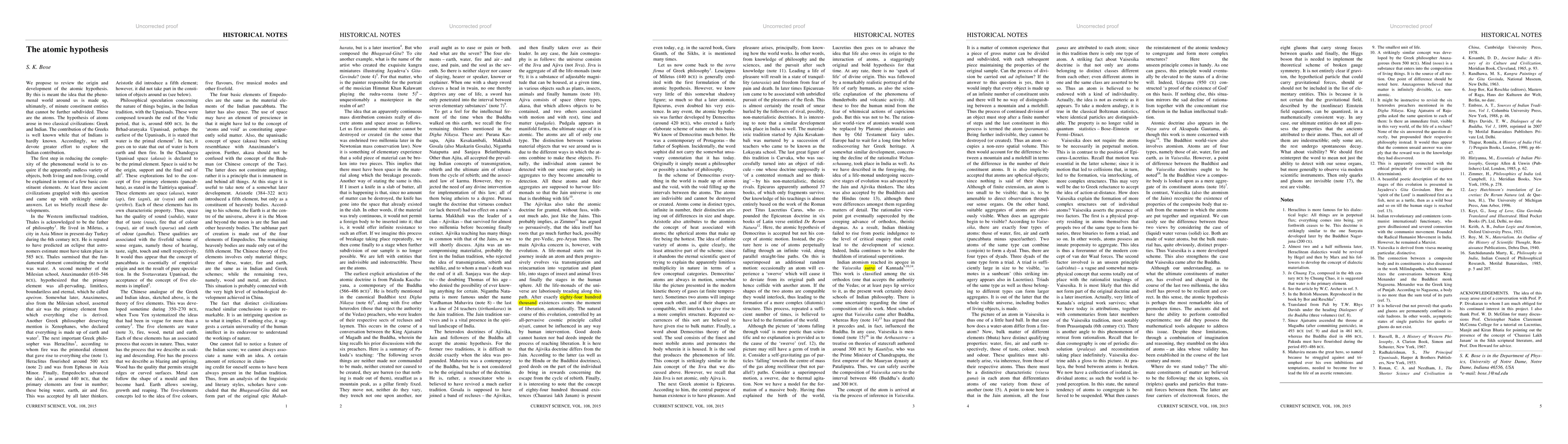 A review is presented of the origin and development of the atomic hypothesis from antiquity till about the first millennium of the common era.