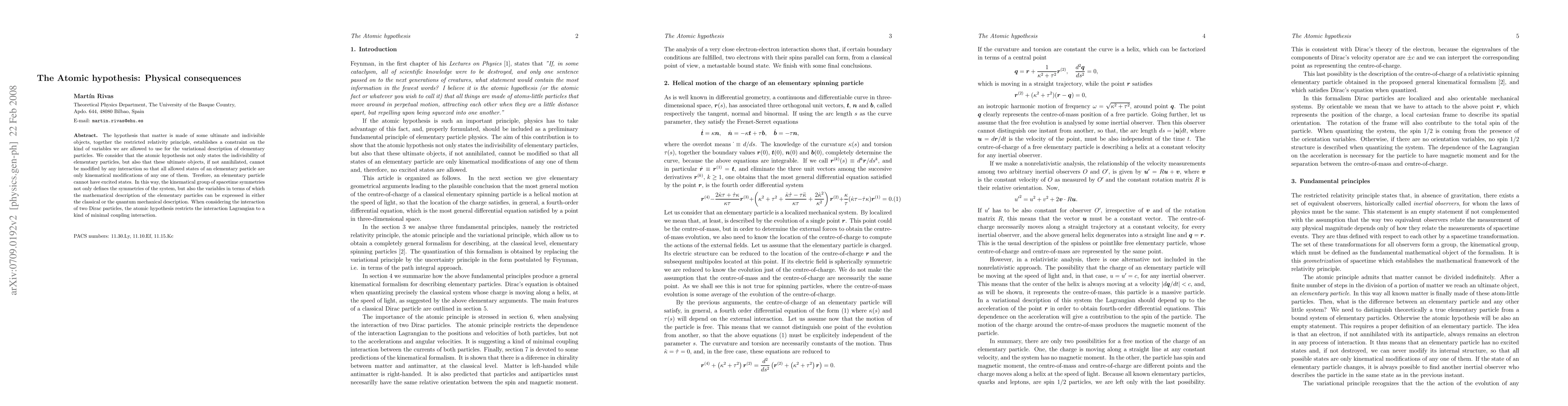 The hypothesis that matter is made of some ultimate and indivisible objects, together the restricted relativity principle, establishes a constraint on the kind of variables we are allowed to use for the variational description of elementary particles. We consider that the atomic hypothesis not only states the indivisibility of elementary particles, but also that these ultimate objects, if not annihilated, cannot be modified by any interaction so that all allowed states of an elementary particle are only kinematical modifications of any one of them. Terefore, an elementary particle cannot have excited states. In this way, the kinematical group of spacetime symmetries not only defines the symmetries of the system, but also the variables in terms of which the mathematical description of the elementary particles can be expressed in either the classical or the quantum mechanical description. When considering the interaction of two Dirac particles, the atomic hypothesis restricts the interaction Lagrangian to a kind of minimal coupling interaction.