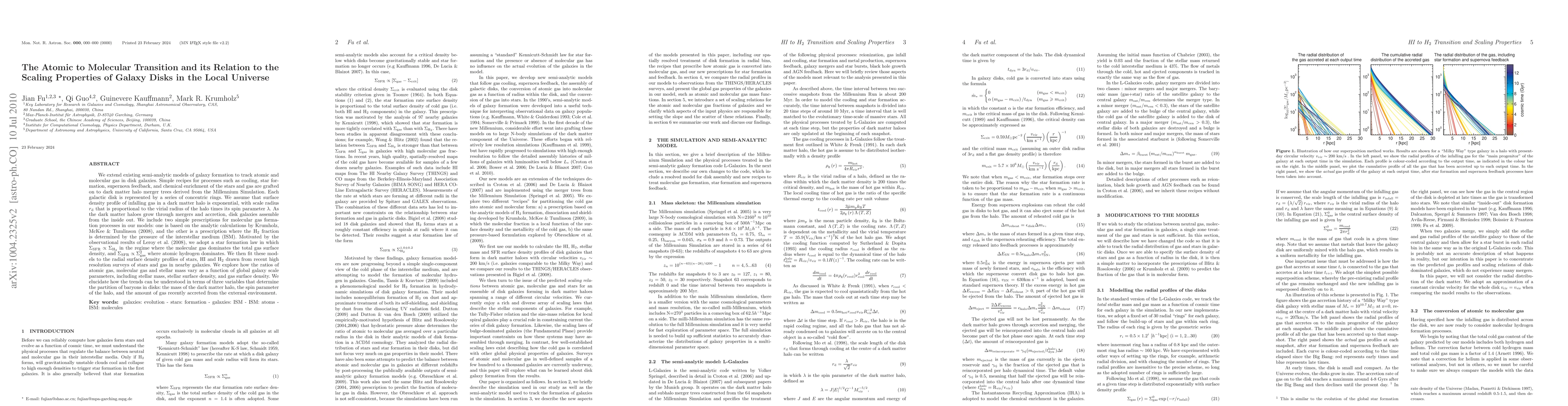 We extend existing semi-analytic models of galaxy formation to track atomic and molecular gas in disk galaxies. Simple recipes for processes such as cooling, star formation, supernova feedback, and chemical enrichment of the stars and gas are grafted on to dark matter halo merger trees derived from the Millennium Simulation. Each galactic disk is represented by a series of concentric rings. We assume that surface density profile of infalling gas in a dark matter halo is exponential, with scale radius r_d that is proportional to the virial radius of the halo times its spin parameter $\lambda$. As the dark matter haloes grow through mergers and accretion, disk galaxies assemble from the inside out. We include two simple prescriptions for molecular gas formation processes in our models: one is based on the analytic calculations by Krumholz, McKee & Tumlinson (2008), and the other is a prescription where the H_2 fraction is determined by the kinematic pressure of the ISM. Motivated by the observational results of Leroy et al. (2008), we adopt a star formation law in which $\Sigma_{SFR}\propto\Sigma_{H_2}$ in the regime where the molecular gas dominates the total gas surface density, and $\Sigma_{SFR}\propto \Sigma_{gas}^2$ where atomic hydrogen dominates. We then fit these models to the radial surface density profiles of stars, HI and H_2 drawn from recent high resolution surveys of stars and gas in nearby galaxies. We explore how the ratios of atomic gas, molecular gas and stellar mass vary as a function of global galaxy scale parameters, including stellar mass, stellar surface density, and gas surface density. We elucidate how the trends can be understood in terms of three variables that determine the partition of baryons in disks: the mass of the dark matter halo, the spin parameter of the halo, and the amount of gas recently accreted from the external environment.